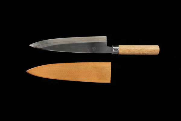 The Souryurin series is relatively thin (not quite a laser, but close), with a medium/lightweight. While they aren’t super lightweight in hand, they aren’t heavy, and despite is western handle appearance, the in-hand feel (along with the weight and balance) is much more similar to that of a Japanese-style handle. The hammered damascus finish is beautifully done, with a very high polish and exceptional fit and finish. Though it is primarily aesthetic, the hammered texture does help in food release. The blade profile, choil shape, and handle design mirror that of similar series they make, focusing on comfort in hand. The choil shape sweeps away from the handle and the spine and choil are very nicely rounded and polished. The blue resin handle has the appearance of dragon scales just under the surface, drawing upon the imagery of Seiryu- the legendary blue dragon. The tapered shape of the handle makes the pinch grip extremely comfortable. No detail has gone unnoticed. The VG10W core is exceptionally well heat treated, as they use molten salt baths in the process, which we agree is an excellent way to go about heat treating this steel. This series also comes with a black wood saya.