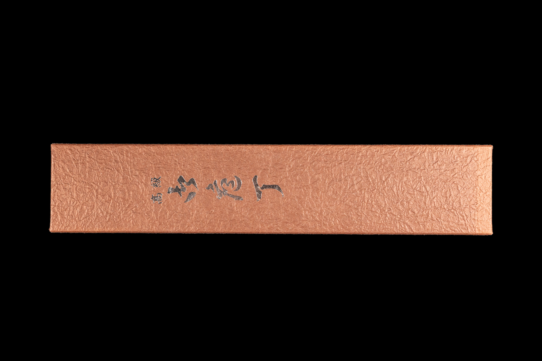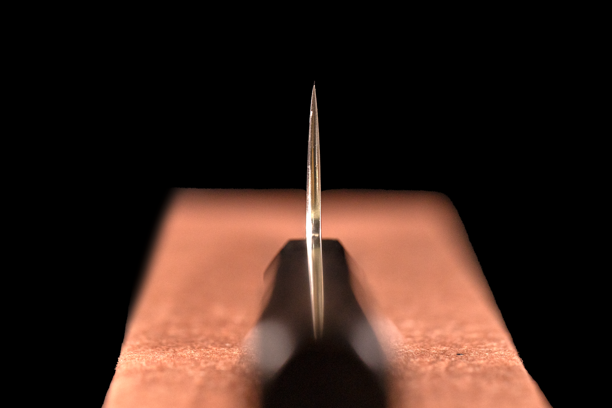 • This Gesshin Ittetsu Honyaki Wa-gyuto was a custom order for us.  The Gesshin Ittetsu wa-gyuto tend to run on the thin side and for a honyaki knife, this is no exception.  Not quite a laser, this knife is still very thin behind the edge.  This honyaki blade also has a beautiful hamon (from the heat treatment process) that is visible on both sides of the blade.  The surfaces of each side have been mirrror polished and the spine and choil have been rounded. The hamon is polished in such a way that the area above it is misty, like a kasumi finish.
