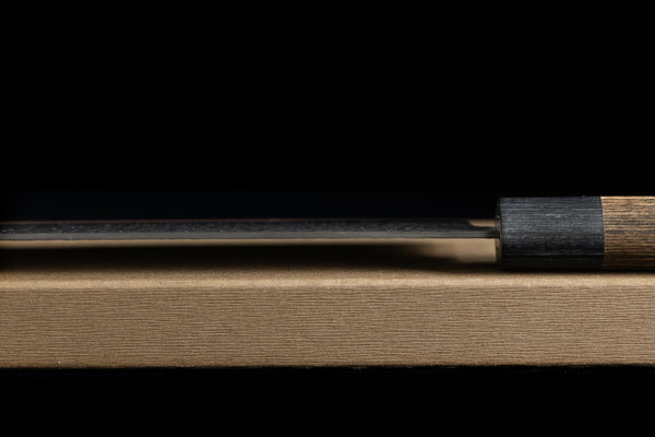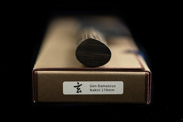 • The Gen series is a VG10 knife made in Seki, and happens to be a very enjoyable version of VG10 to use and sharpen. The handles are right-handed d-shaped pakkawood with a stainless inserts at the top that helps prevent water from getting into the handle without overlapping the ferrule and increase the resistance to bending at the handle. The fit and finish on this series is very nice, and the kurouchi hammered damascus aesthetic is excellent. They are relatively thin, and yet still retain decent toughness and durability. We think they will work well for both home cooks and working professionals alike. The boxes are also very nice and are made in the “shihouchitsu” style, with clasps to hold the box closed.