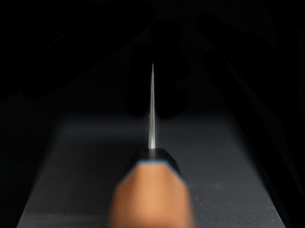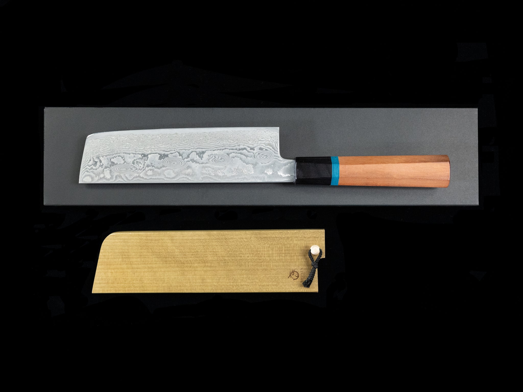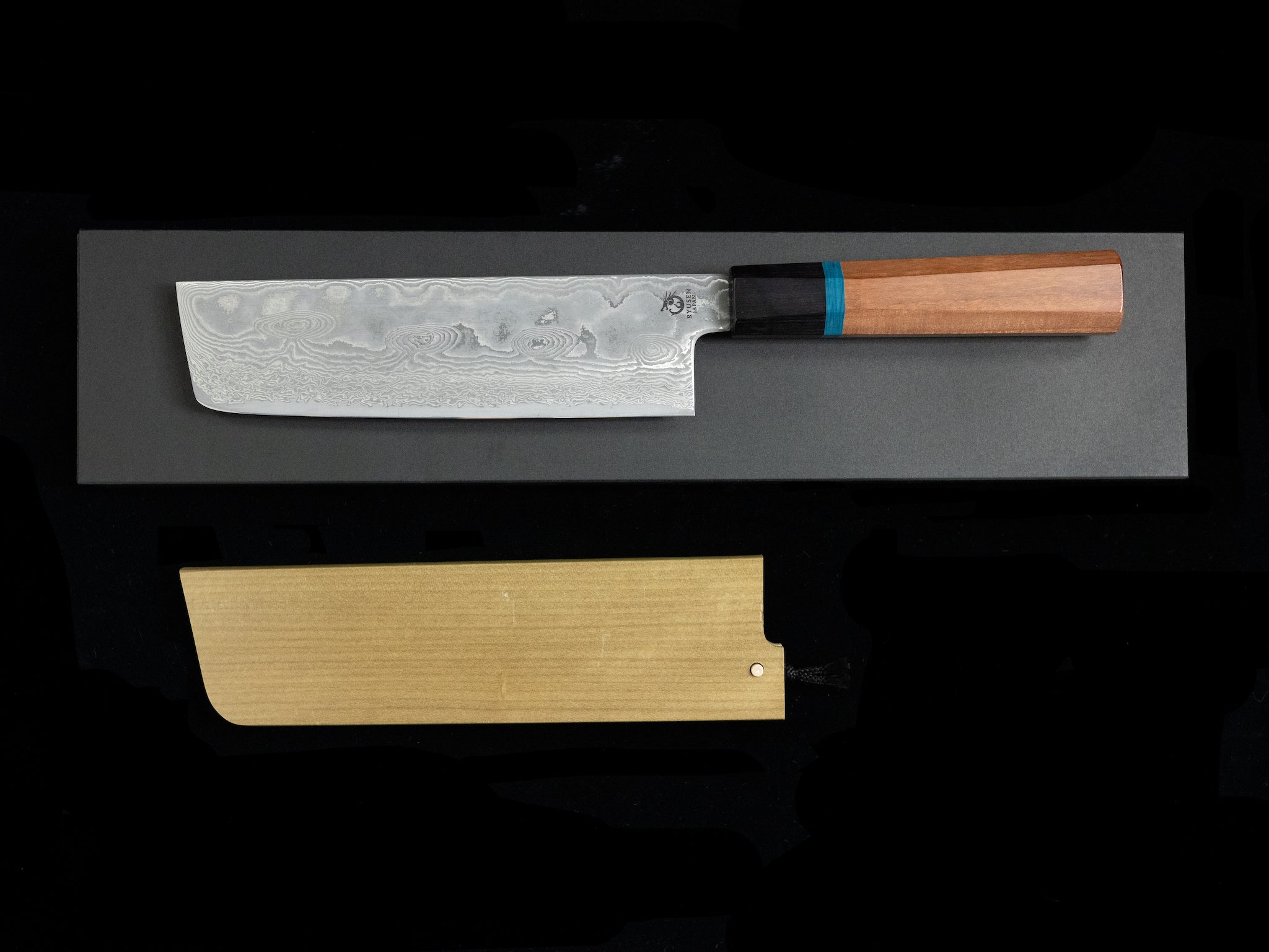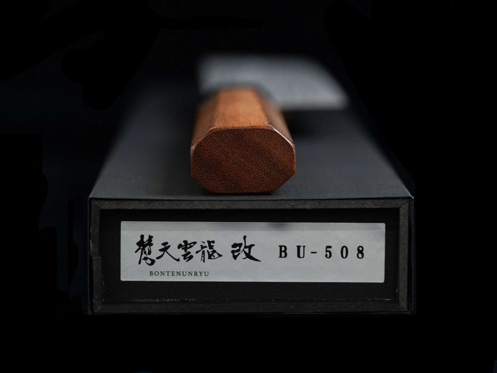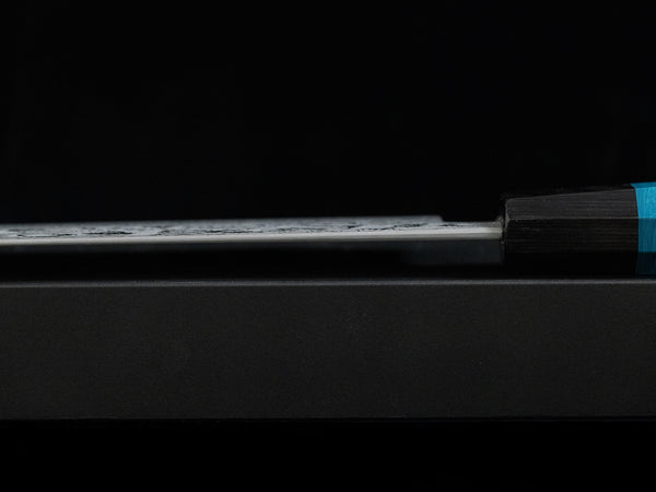 The Bontenunryu series is a medium weight series. While they aren’t super lightweight in hand, they aren’t heavy… they have a great in-hand feel. The Damascus cladding very elegant, and the fit and finish on the blade is very nice. The western style handles are also extremely well finished. The knives have nice distal taper and are ground quite thin at and behind the edge, with a medium thickness along the spine (by no means thick). The VG-10 core is exceptionally well heat treated, as they use molten salt baths in the process, which we agree is an excellent way to go about heat treating this steel. This knife comes with a ho wood saya.