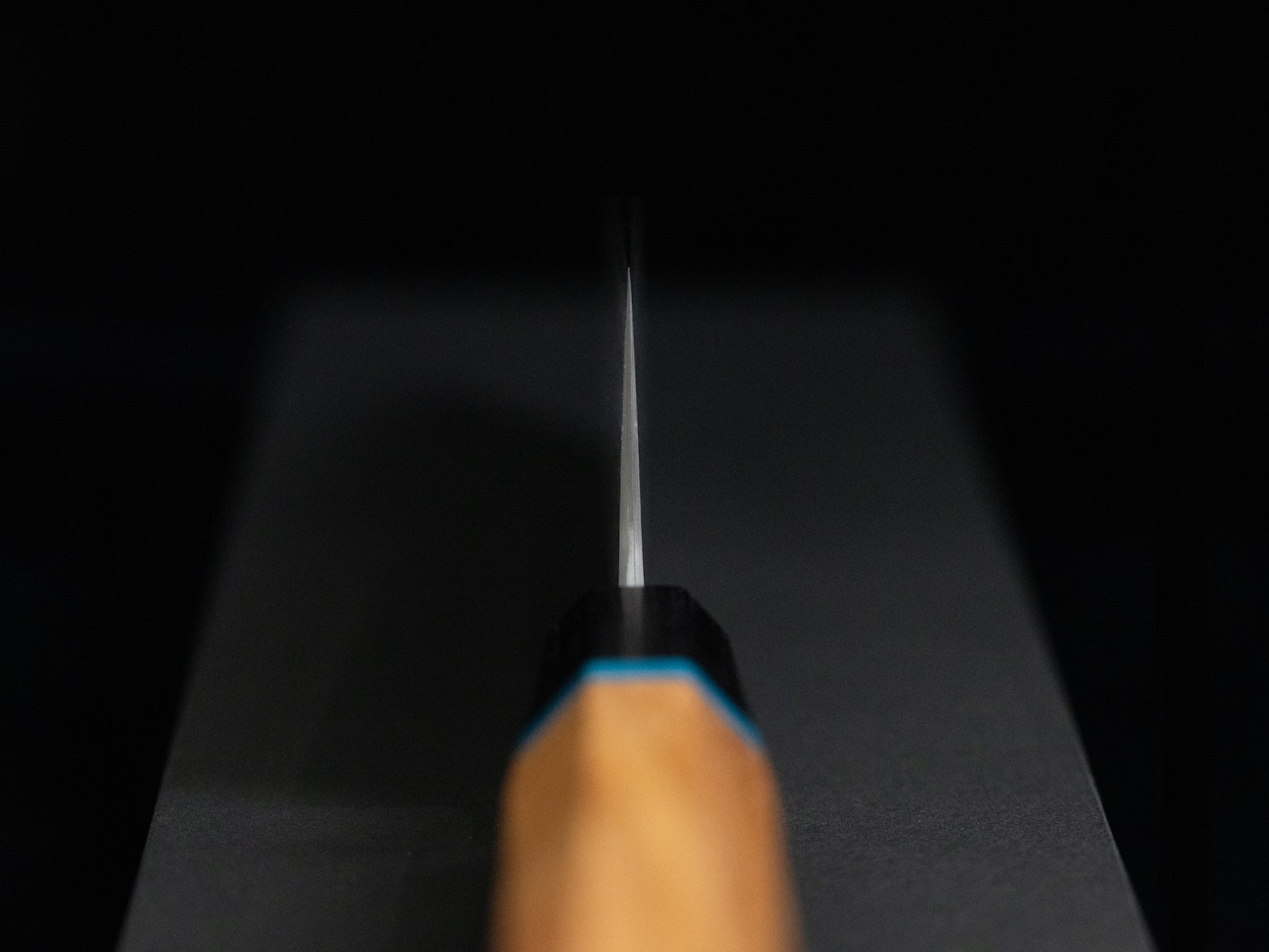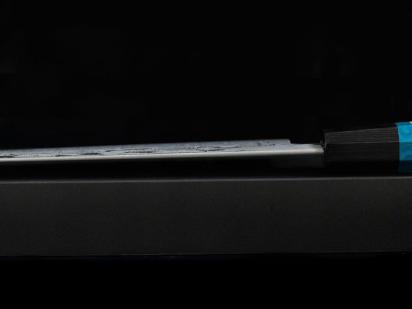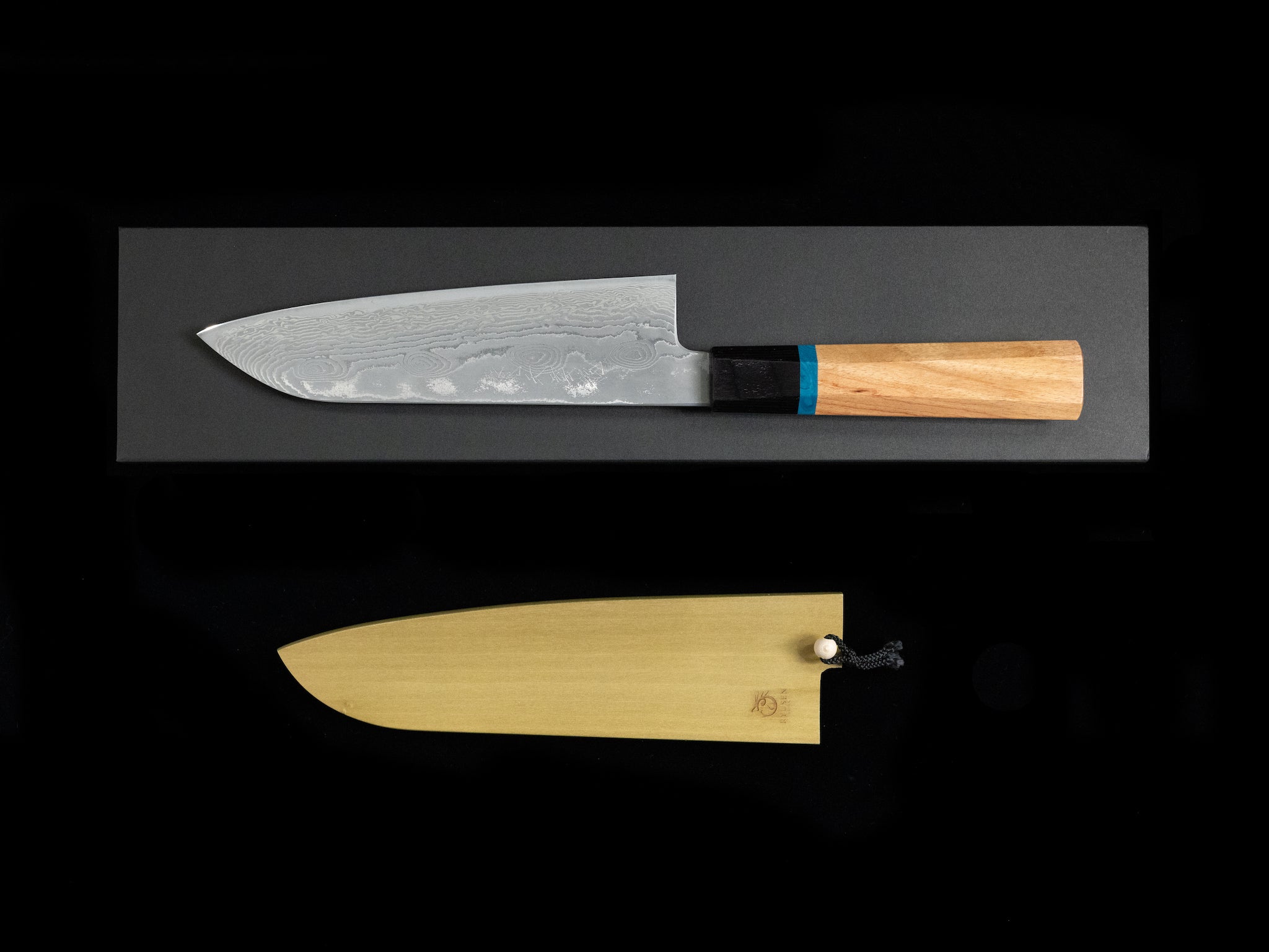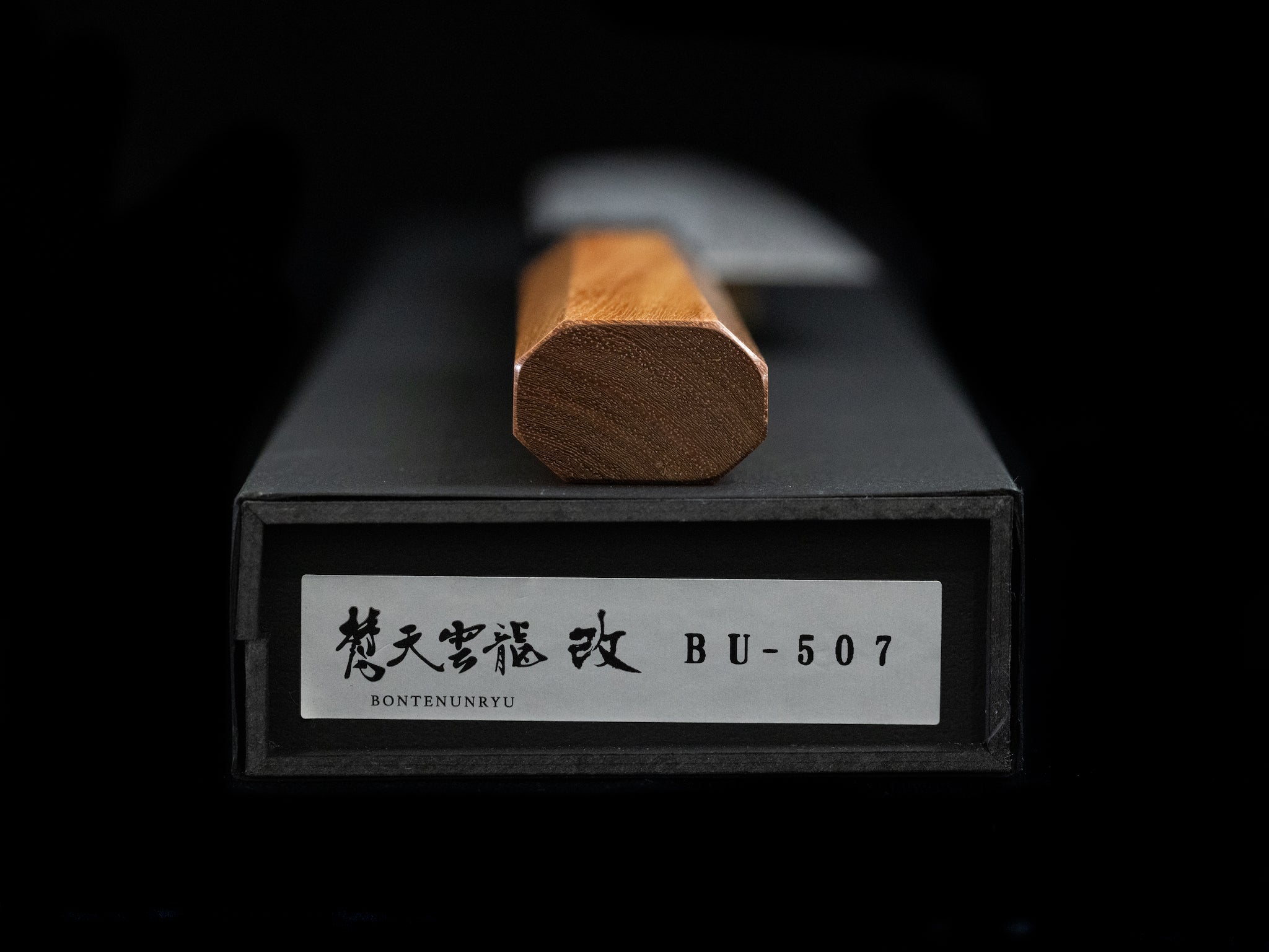 The Bontenunryu series is a medium weight series.  While they aren’t super lightweight in hand, they aren’t heavy… they have a great in-hand feel. The Damascus cladding very elegant, and the fit and finish on the blade is very nice. The western style handles are also extremely well finished. The knives have nice distal taper and are ground quite thin at and behind the edge, with a medium thickness along the spine (by no means thick). The VG-10 core is exceptionally well heat treated, as they use molten salt baths in the process, which we agree is an excellent way to go about heat treating this steel. This knife comes with a ho wood saya and pin.