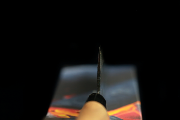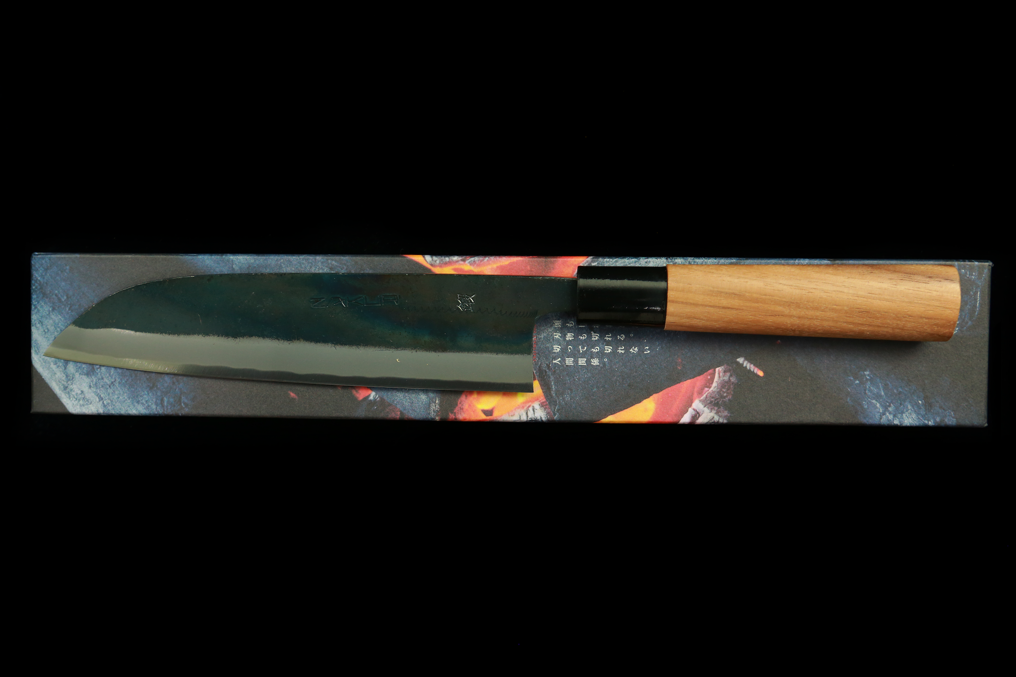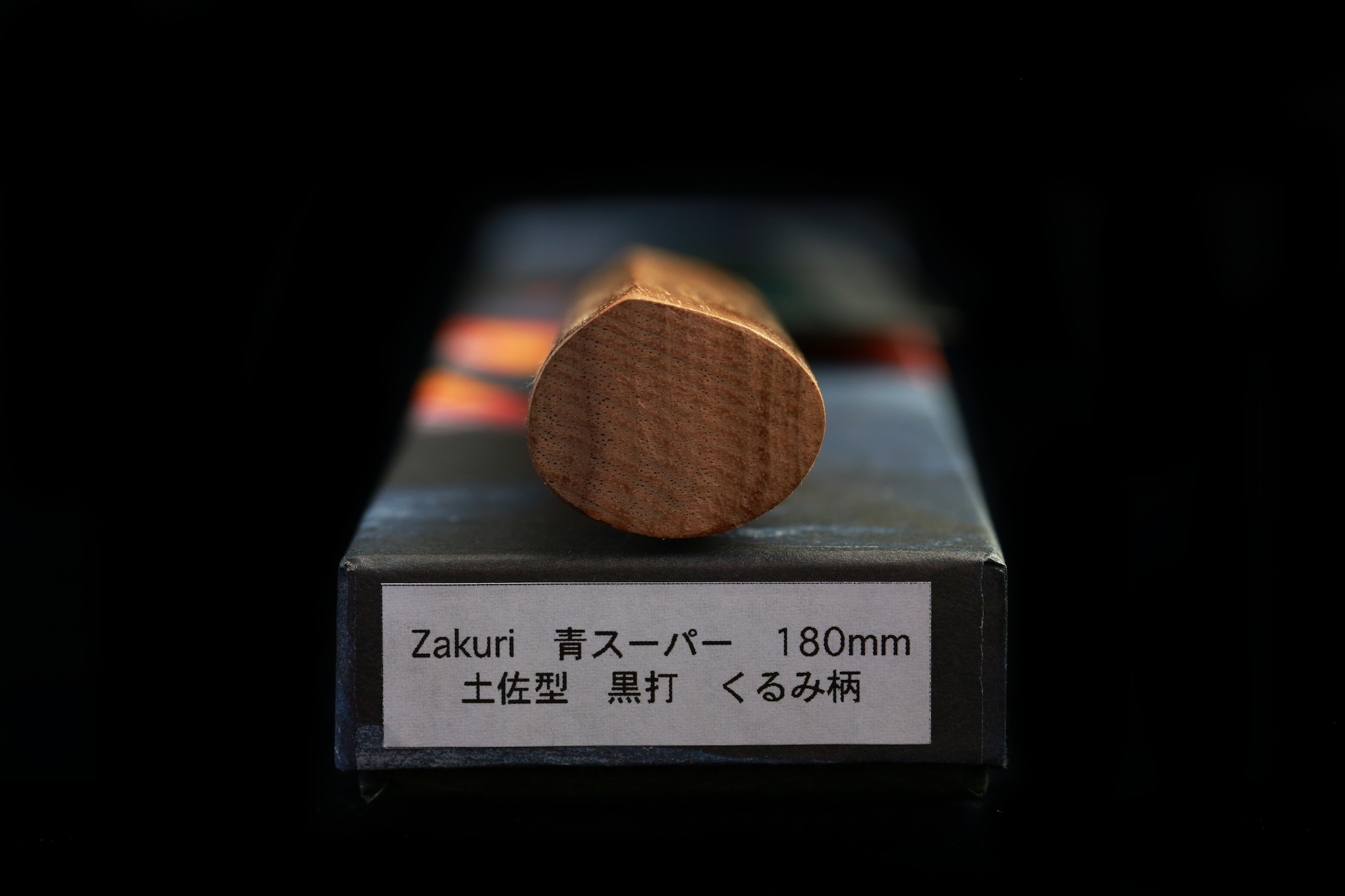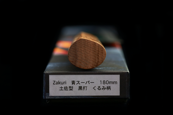 • Based on a recommendation from one of our customers, we have decided to bring you the Tosagata bocho from Zakuri. Zakuri is based in the Tosa region and the Tosagata Bocho is a unique Tosa based knife. It is very much like a thin and nimble santoku. At 165mm this knife is a great size for home cooks or for professional cooks as a utility or line knife. The Blue Super in the knife will take very good edge and has amazing edge holding capabilities. As with most carbon knives, this one sharpens very easily too. The kurouchi finish on this knife helps prevent rust, but this knife should still be cleaned and dried before after use. The D-shaped handle on this knife is made of walnut and it has a plastic ferrule.