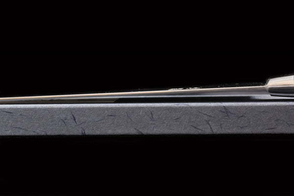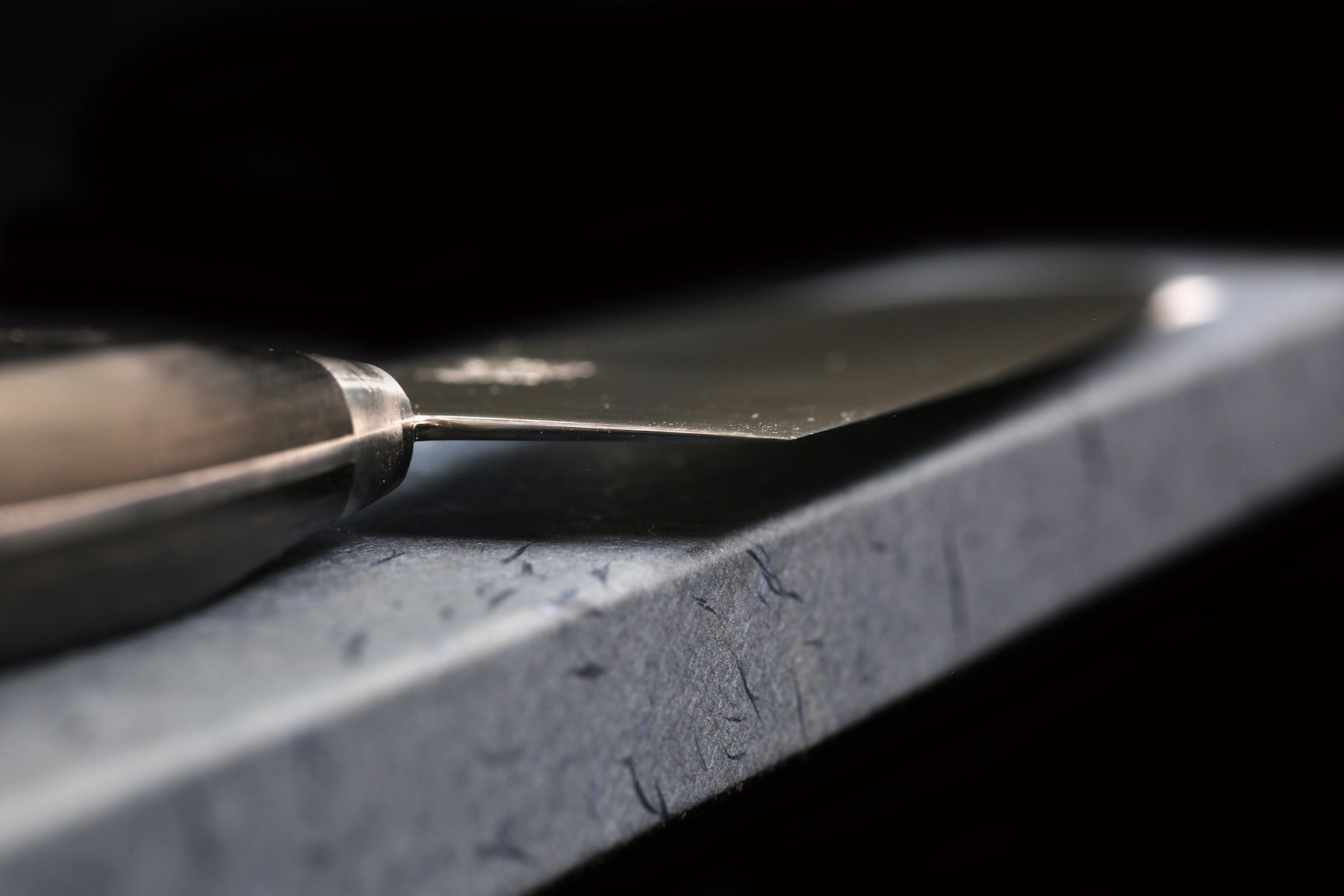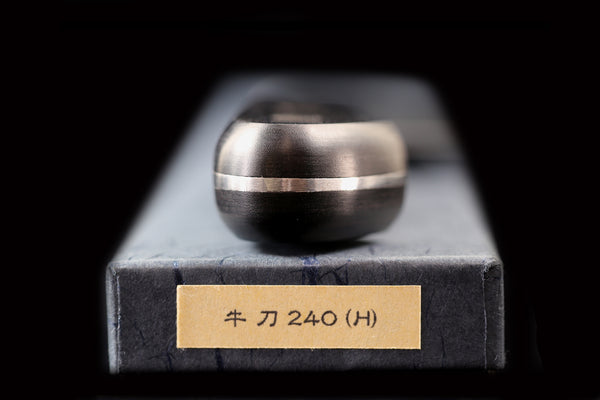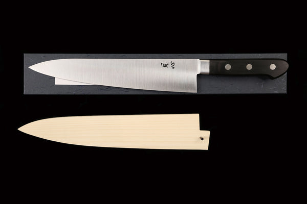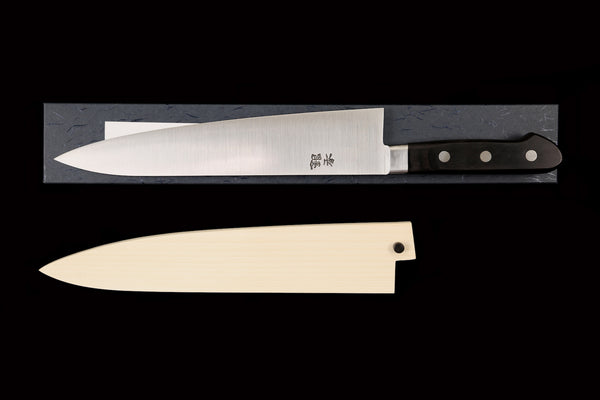 • The Gesshin Ginga line is a custom line we have produced for us exclusively.  These knives are very thin and light and have great fit and finish.  The spine and choil are rounded and polished.  The white #2 steel (carbon steel) is very finely grained and hardened to about 61HRC.  These knives take a great edge, sharpen easily, resist chipping well, and have great cutting performance due to their awesome geometry.