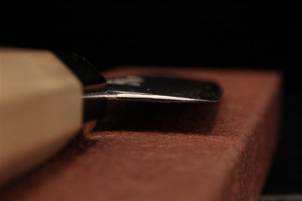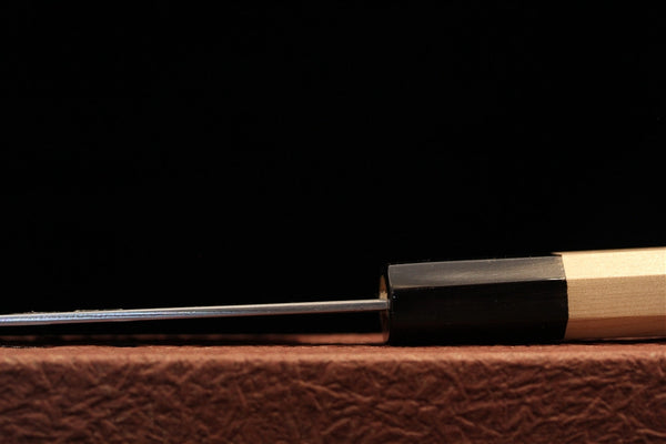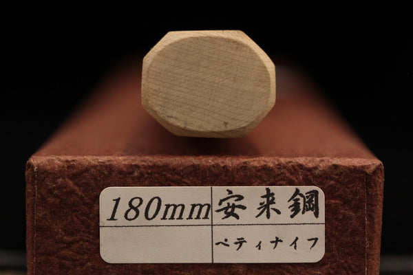 • This Gesshin Ittetsu 180mm White #2 Hon-Kasumi Wa-Petty comes with a ho wood octagonal handle and matching saya. The sides of this knife have a misty white polish and the core steel can be seen in a slightly more polished finish near the edge. When visiting Ittetsu last year, we saw this kind of finish on some knives in their workshop and asked if we could have some made. The knife is also on the thinner side of what we normally see with hand forged clad knives. The profile and grind are very nice and the polish is really fascinating.