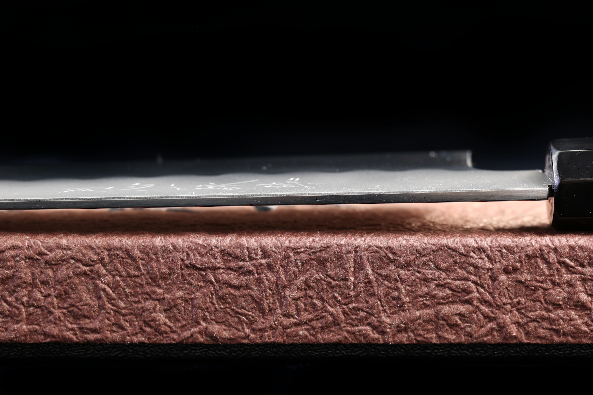 • This Gesshin Ittetsu Honyaki Wa-gyuto was a custom order for us. The Gesshin Ittetsu wa-gyuto tend to run on the thin side and for a honyaki knife, this is no exception. Not quite a laser, this knife is still very thin behind the edge. This honyaki blade also has a beautiful hamon (from the heat treatment process) that is visible on both sides of the blade. The surfaces of each side have been mirrror polished and the spine and choil have been rounded. The hamon is polished in such a way that the area above it is misty, like a kasumi finish.