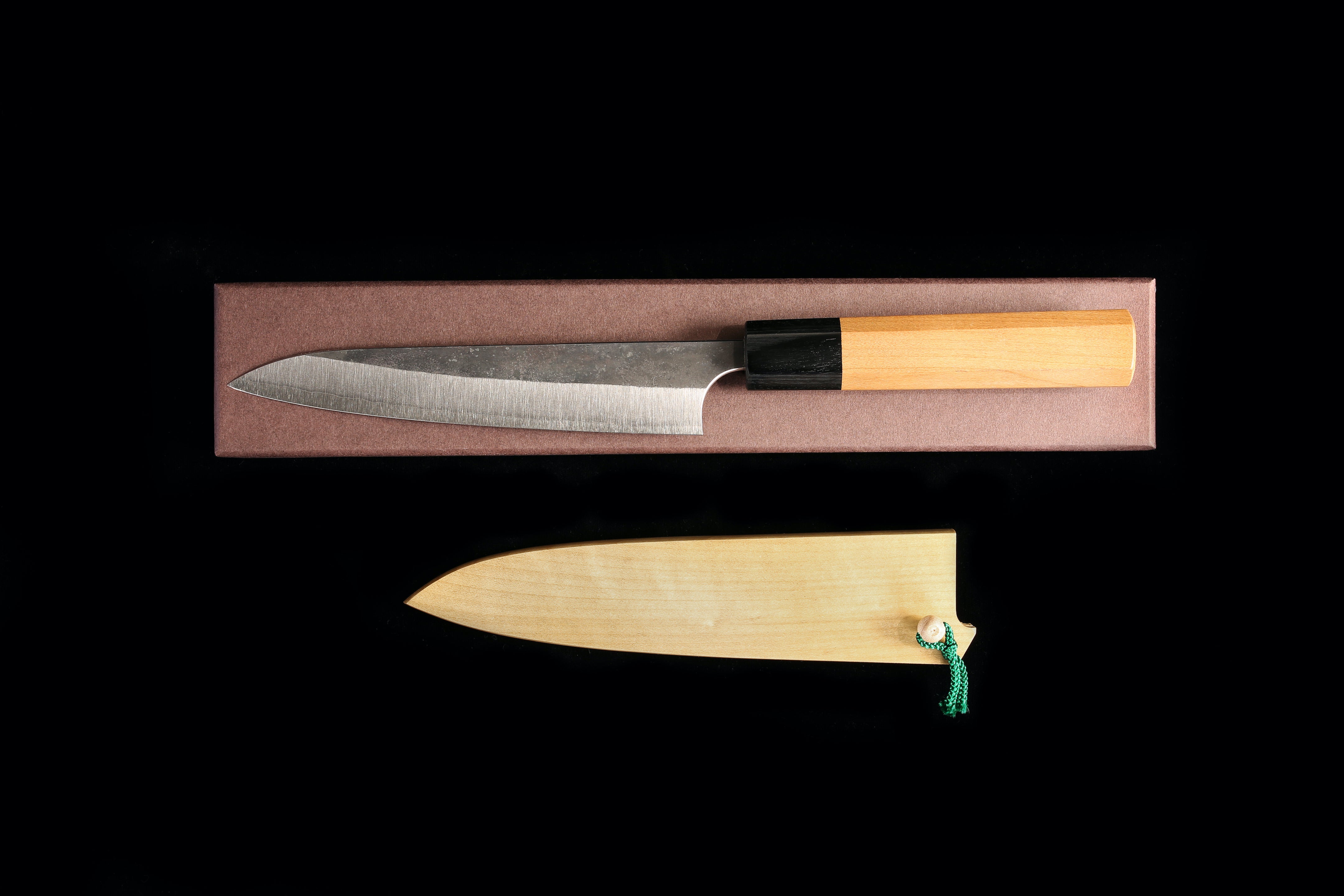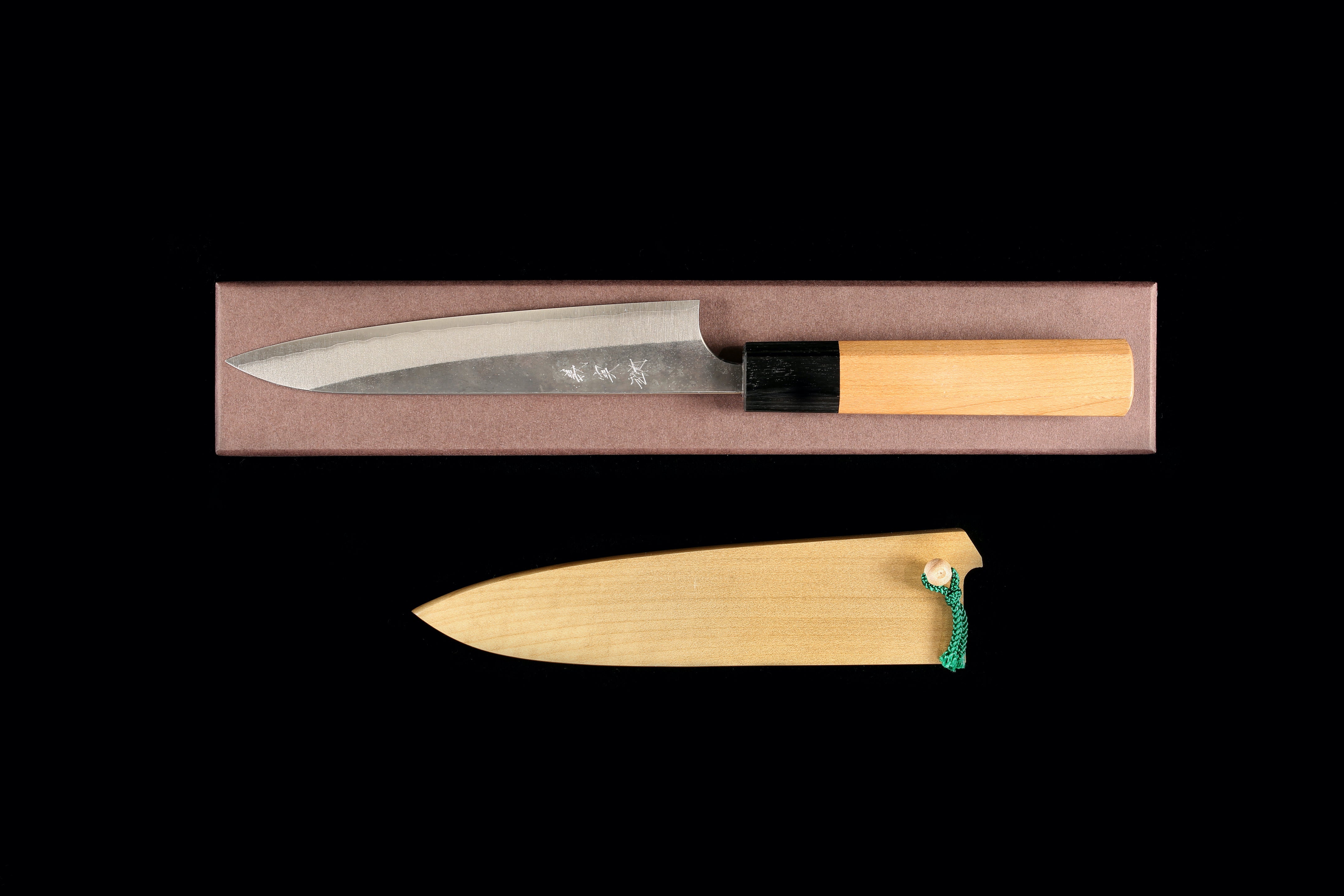The core is Blue Super carbon steel and clad in a kurouchi stainless steel. This model will have better edge retention and corrosion resistance than the White #2 model. Conversely, it will not get quite as sharp, will be more time-consuming to sharpen, and will be a bit more brittle than the White #2 model. They are also a tiny bit thicker at the spine than the White #2. These knives come with a saya, either ho wood, as pictured, or black (not pictured).