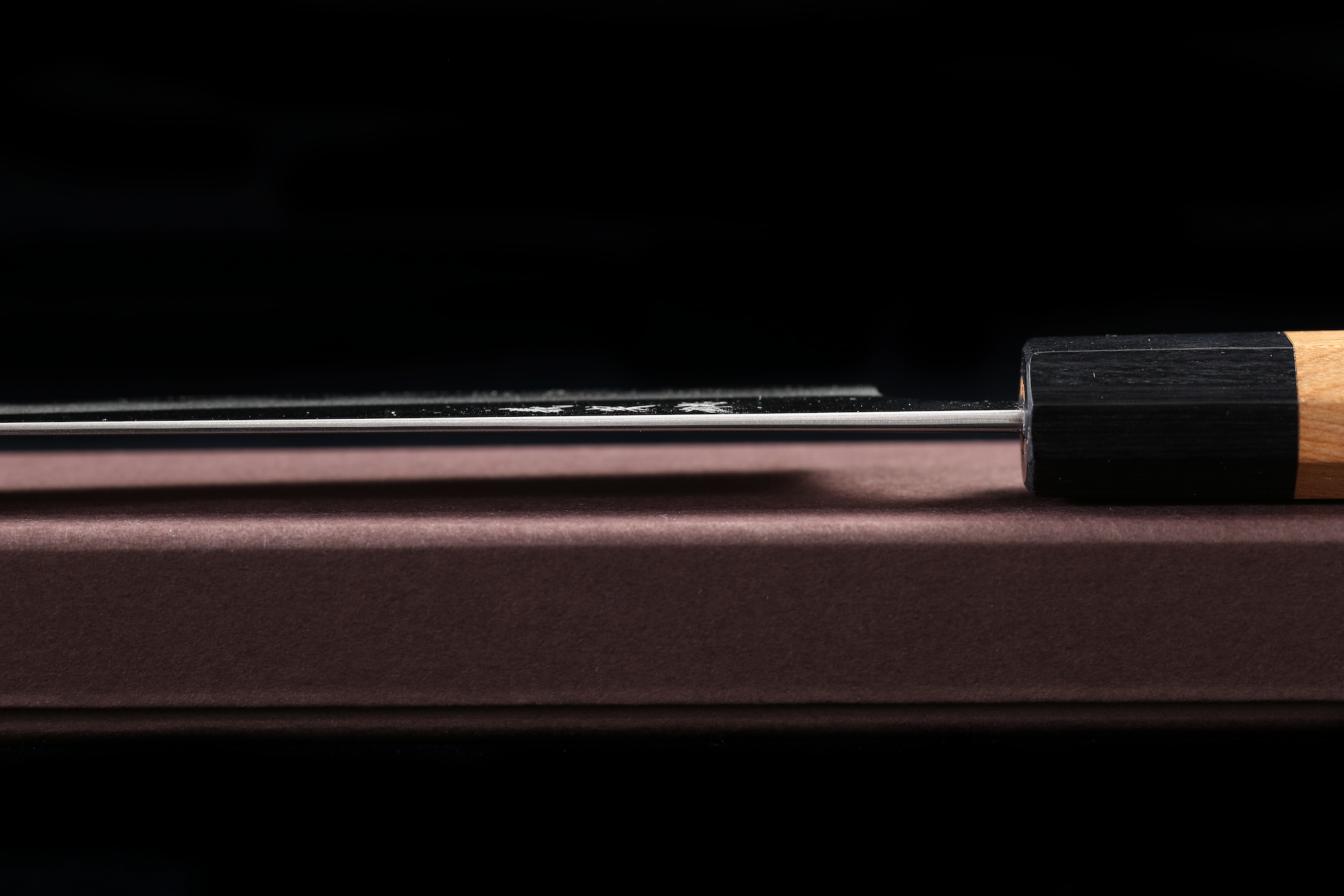 These knives have an excellent profile, grind, and distal taper, as well as clean fit and finish. Both the kurouchi and migaki models are clad in stainless steel. The stainless cladding reduces the reactive surface area of the knives to the few millimeters in between the cutting edge and lamination line.