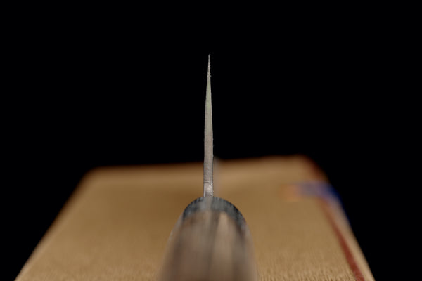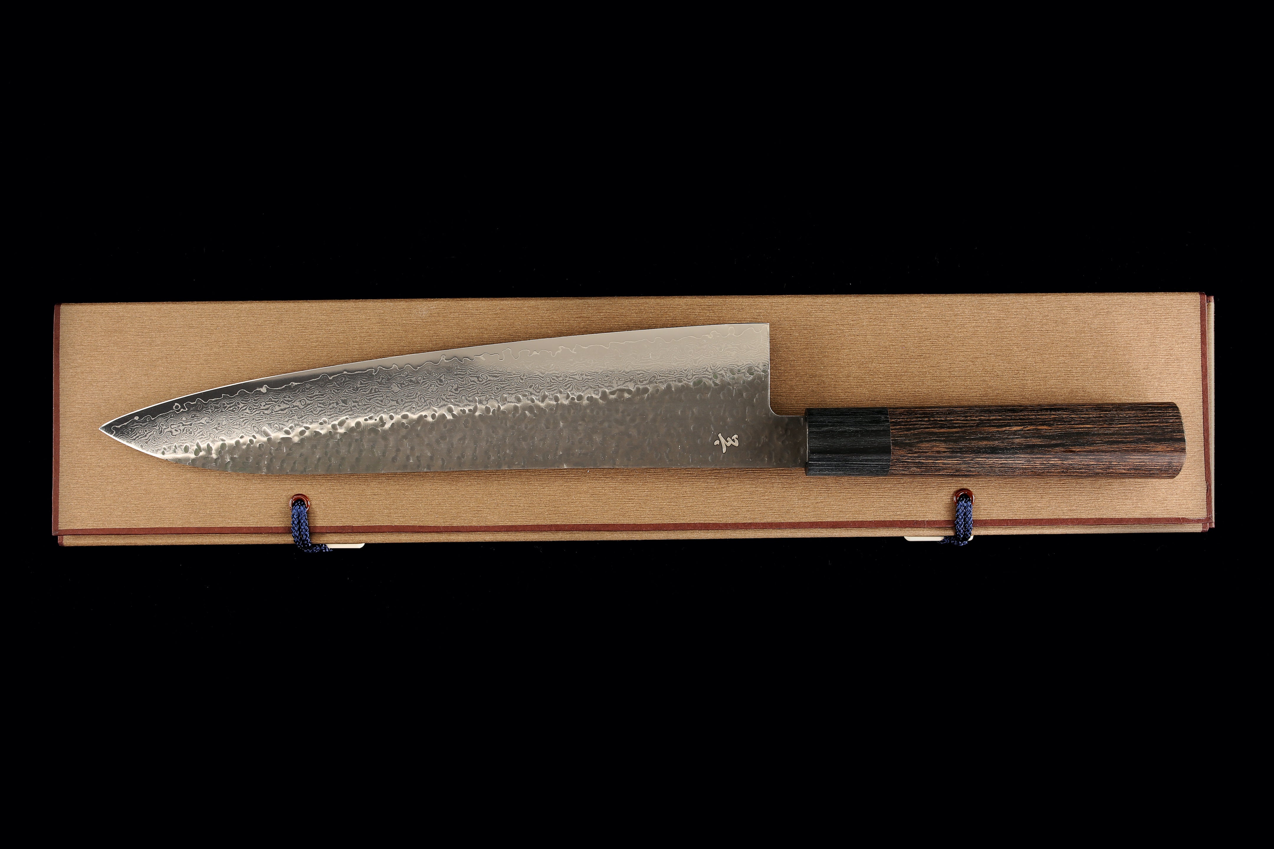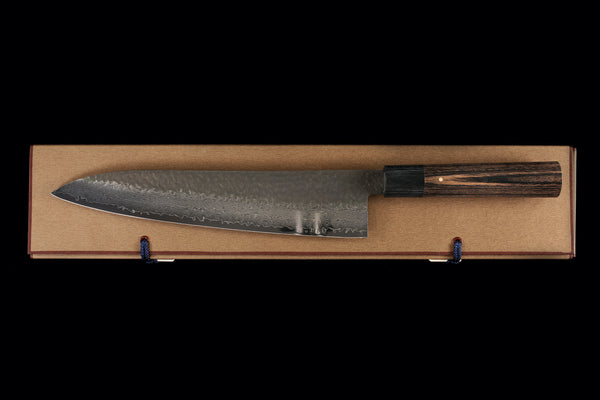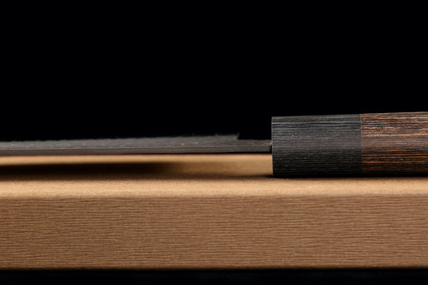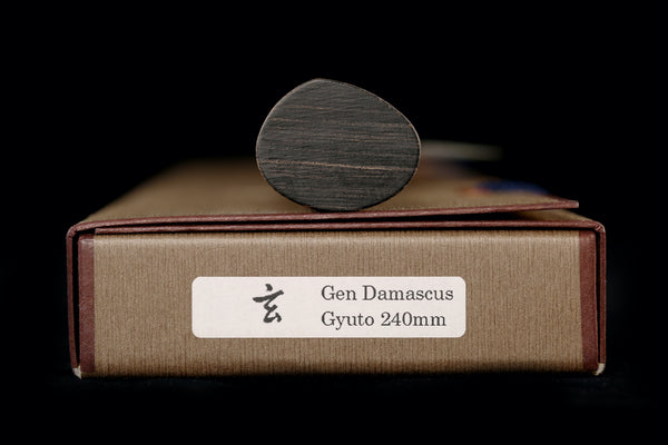 The Gen series is a VG10 knife made in Seki, and happens to be a very enjoyable version of VG10 to use and sharpen. The handles are right-handed d-shaped pakkawood with a stainless inserts at the top that helps prevent water from getting into the handle without overlapping the ferrule and increase the resistance to bending at the handle. The fit and finish on this series is very nice, and the kurouchi hammered damascus aesthetic is excellent. They are relatively thin, and yet still retain decent toughness and durability. We think they will work well for both home cooks and working professionals alike. The boxes are also very nice and are made in the “shihouchitsu” style, with clasps to hold the box closed.