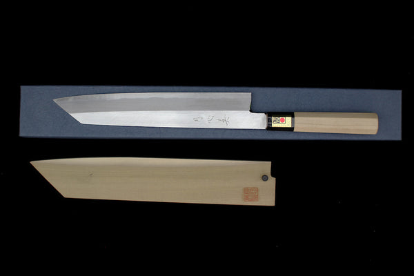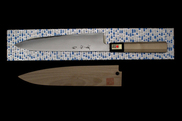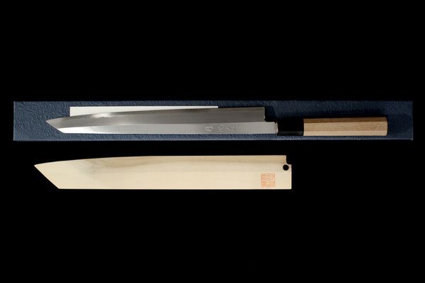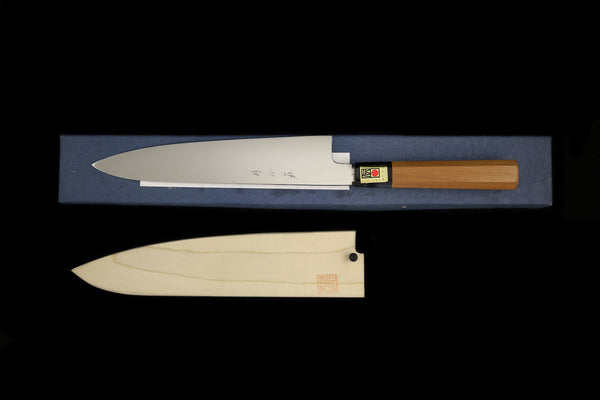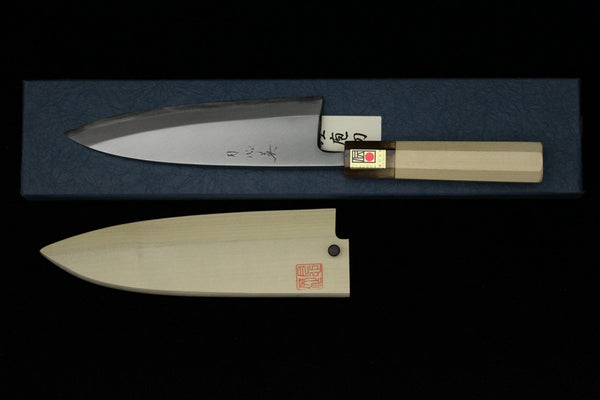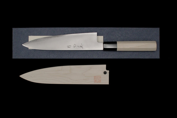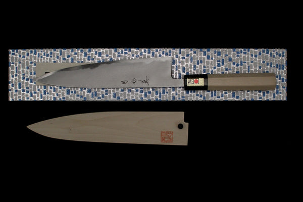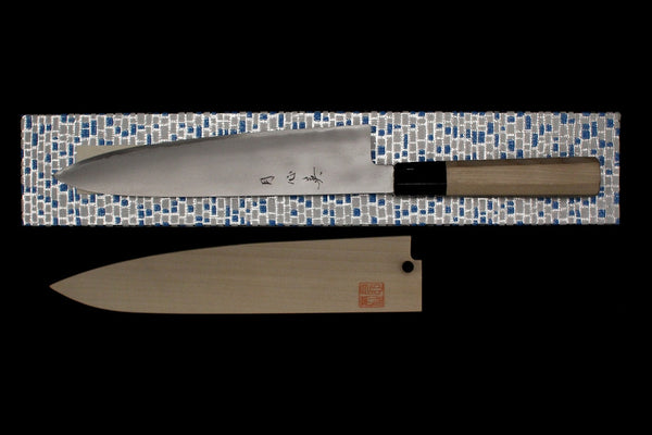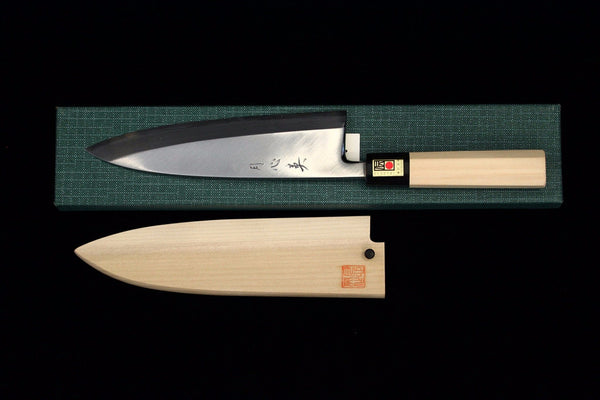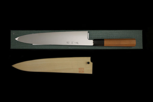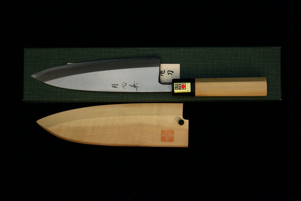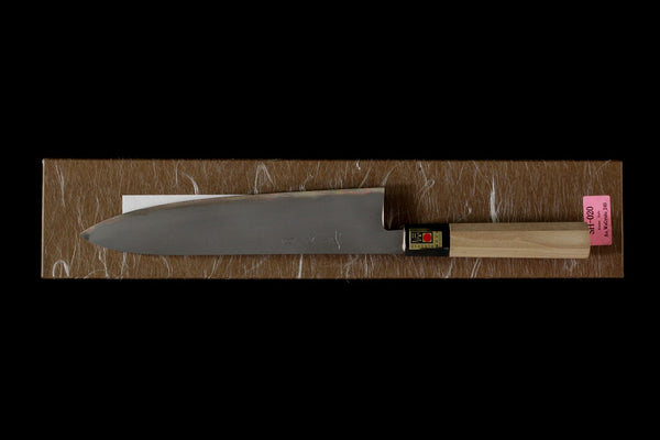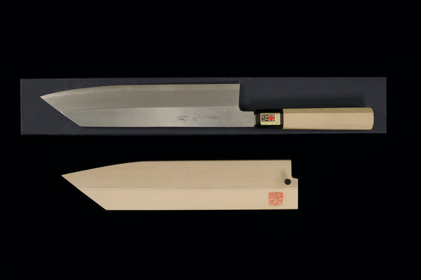 Together with the skilled craftsmen, Yamamoto Hideaki and Yamamoto Shinichiro, we are proud to introduce Gesshin Hide. These knives represent the best of Sakai Uchihamono. From the first time I sharpened one of these knives in 2010, I knew how amazing they were. With a combination of great steel and amazing grinding, shaping, and sharpening work, these knives are easily among the best single bevel knives I have used. The spines and choils are also nicely rounded and polished. These also feature a mirror polish on the front face of the knife.