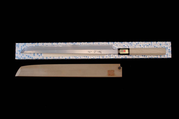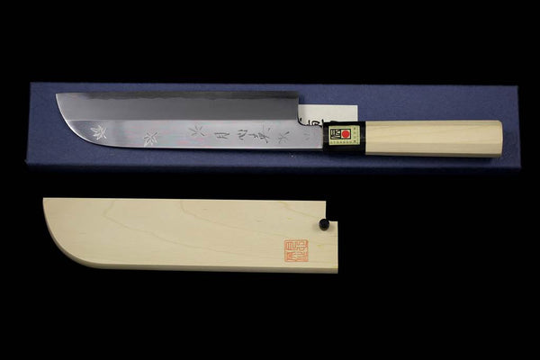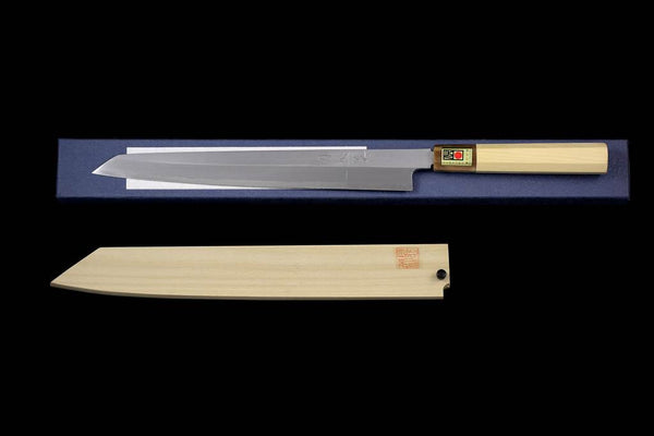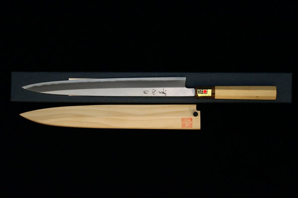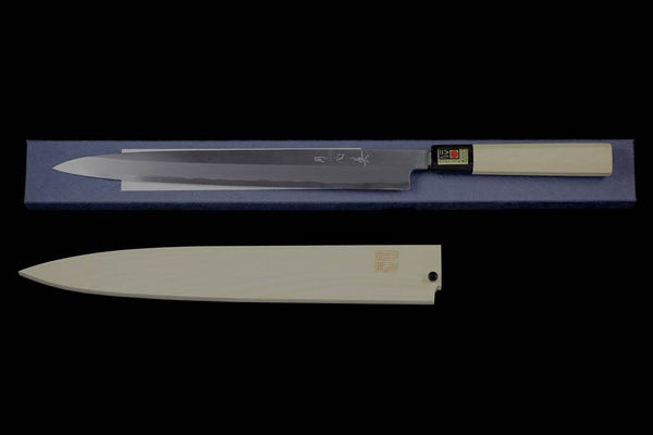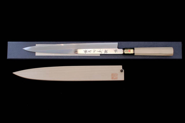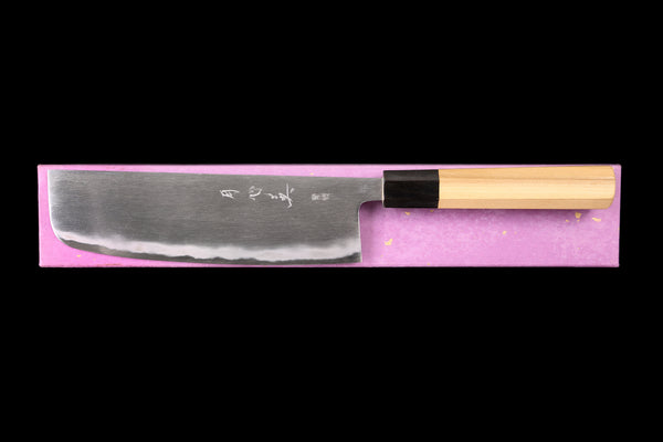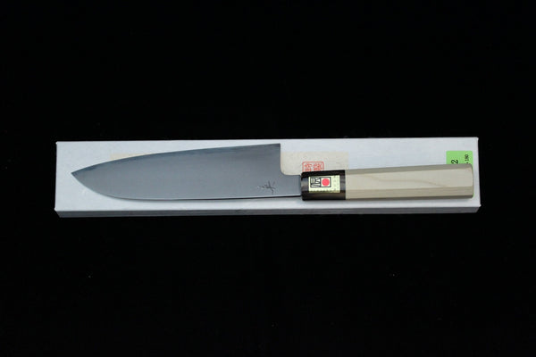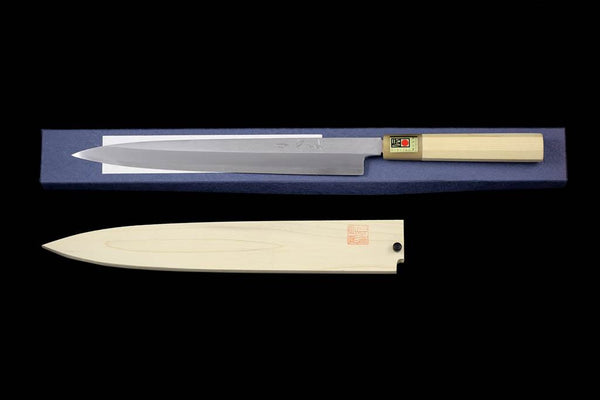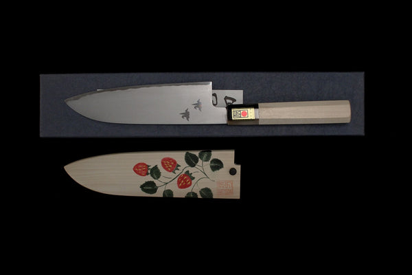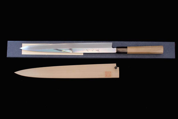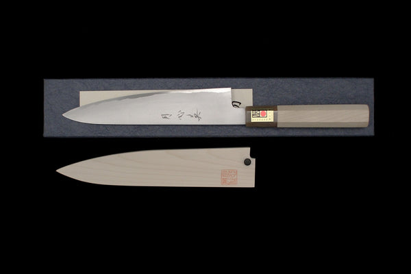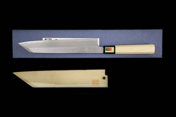 Together with the skilled craftsmen, Yamamoto Hideaki and Yamamoto Shinichiro, we are proud to introduce Gesshin Hide. These knives represent the best of Sakai Uchihamono. From the first time I sharpened one of these knives in 2010, I knew how amazing they were. With a combination of great steel and amazing grinding, shaping, and sharpening work, these knives are easily among the best single bevel knives I have used. The spines and choils are also nicely rounded and polished. These also feature a mirror polish on the front face of the knife.