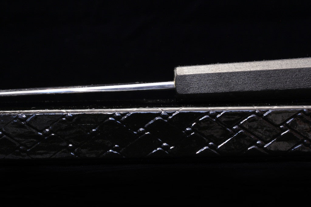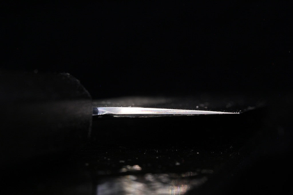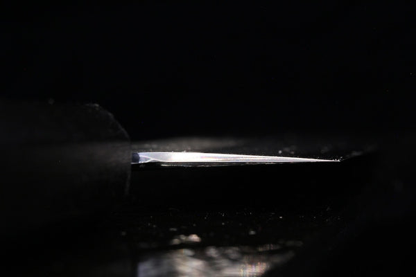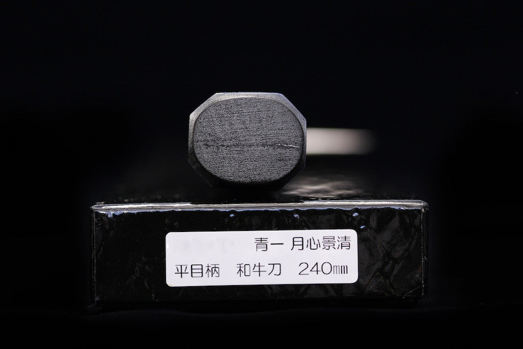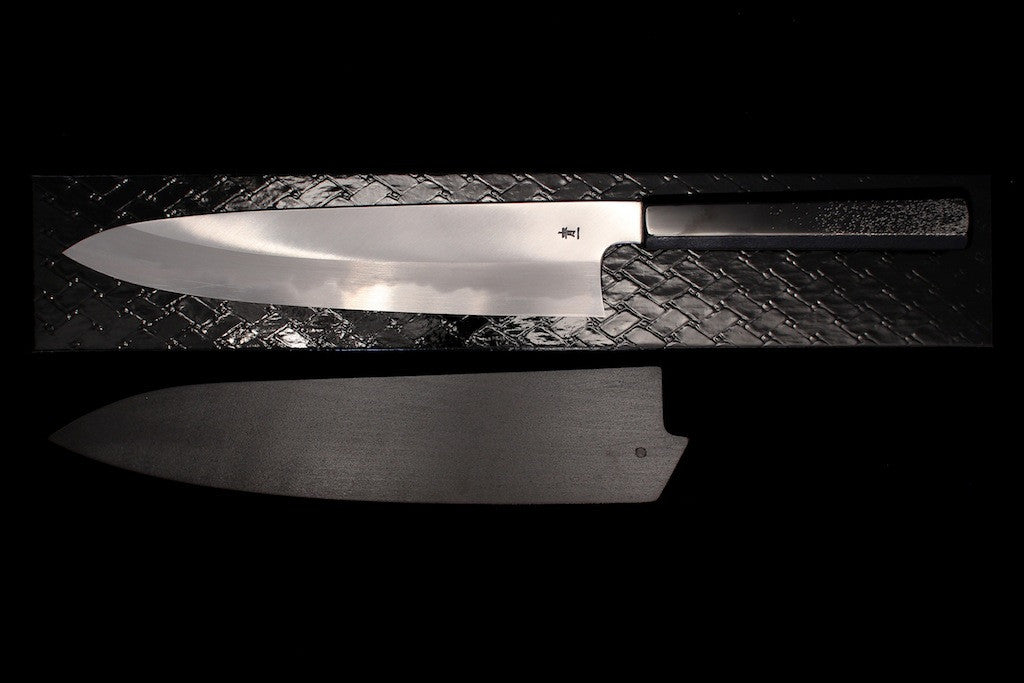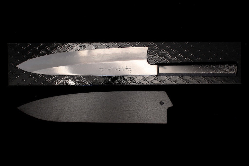 The Gesshin Kagekiyo knives represent some of the highest levels of craftsmanship and quality we have seen. The blacksmiths, sharpeners, and even lacquerware craftsmen are all amazingly skilled, as can clearly be seen by simply looking at them. In fact, all of the craftsmen are certified craftsmen or dentou-kougeishi (a very prestigious honor). These knives have amazing fit and finish, spectacular grinds, some of the most beautiful handles and saya we've seen on Japanese knives, and amazing geometry. They are really thin behind the edge, have great distal taper, and wide bevels, making them easier to thin and sharpen. The lacquer craftsmen uses real lacquer on these, not synthetic lacquer as more commonly used. Even the boxes are beautiful lacquerware. We hope you guys are as excited as we are.