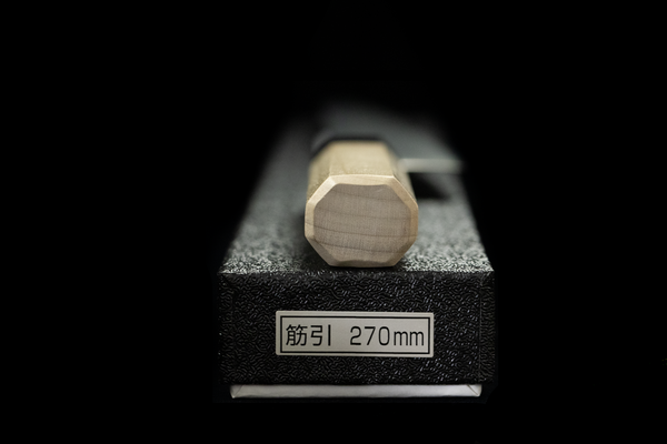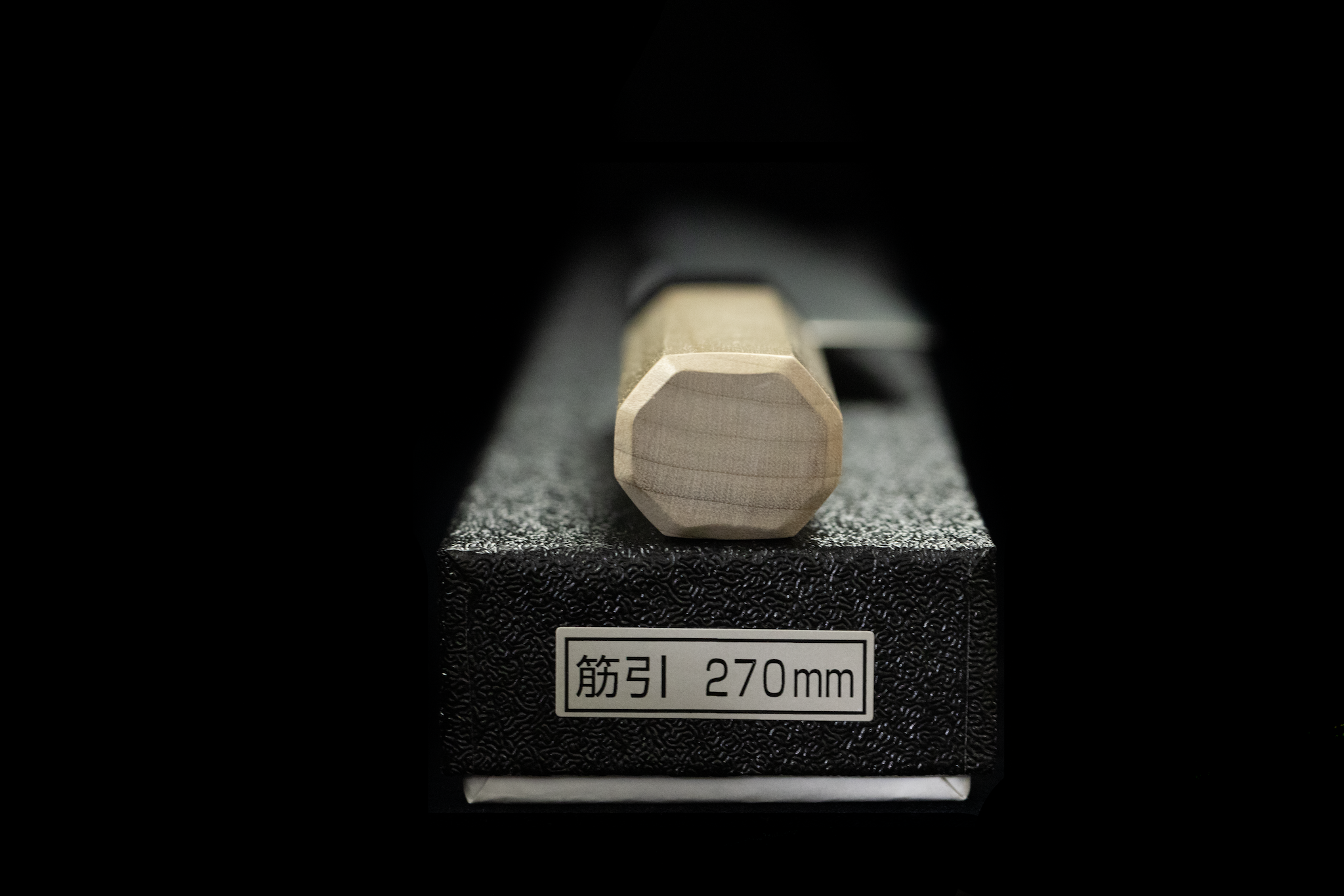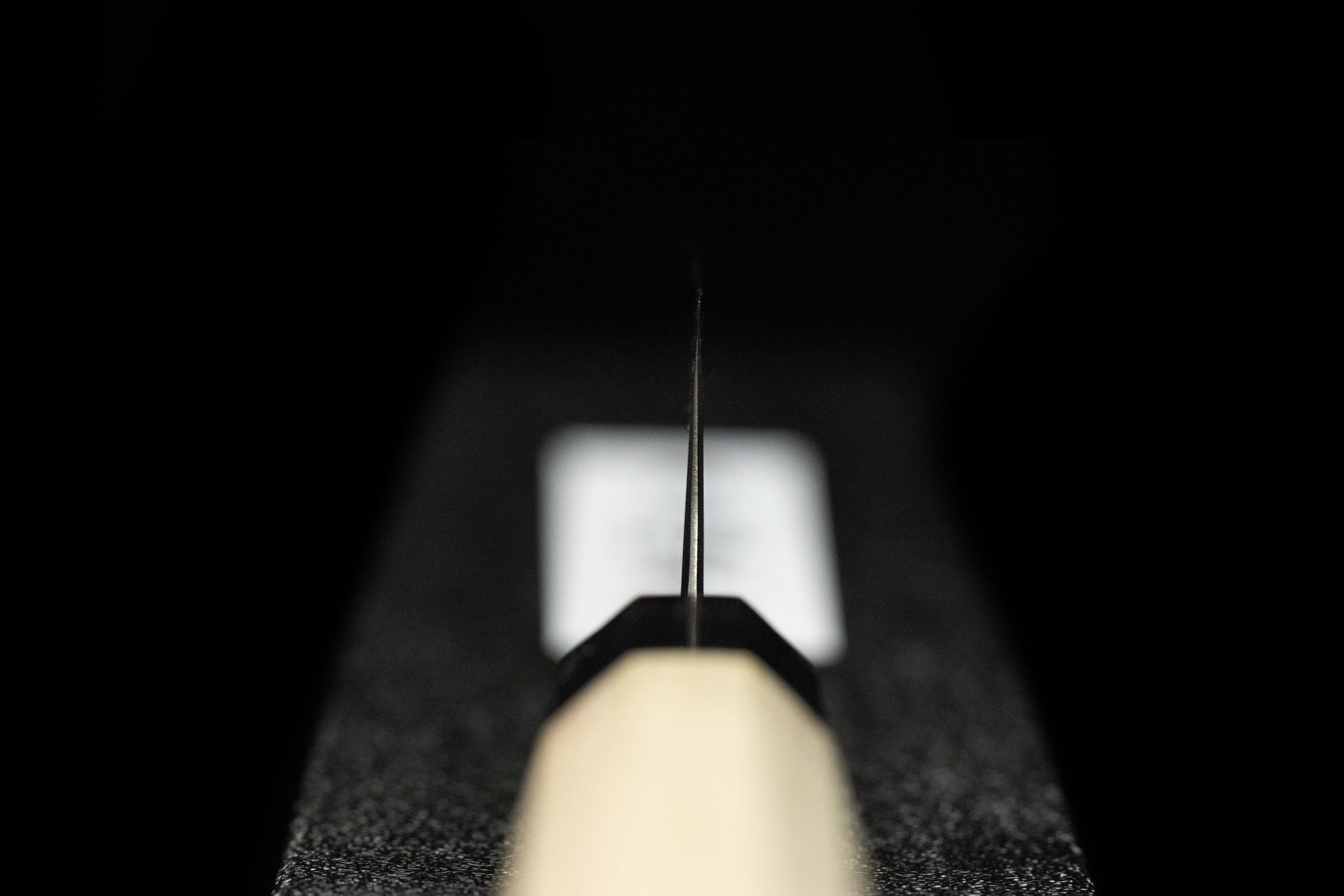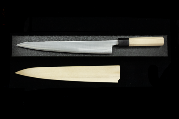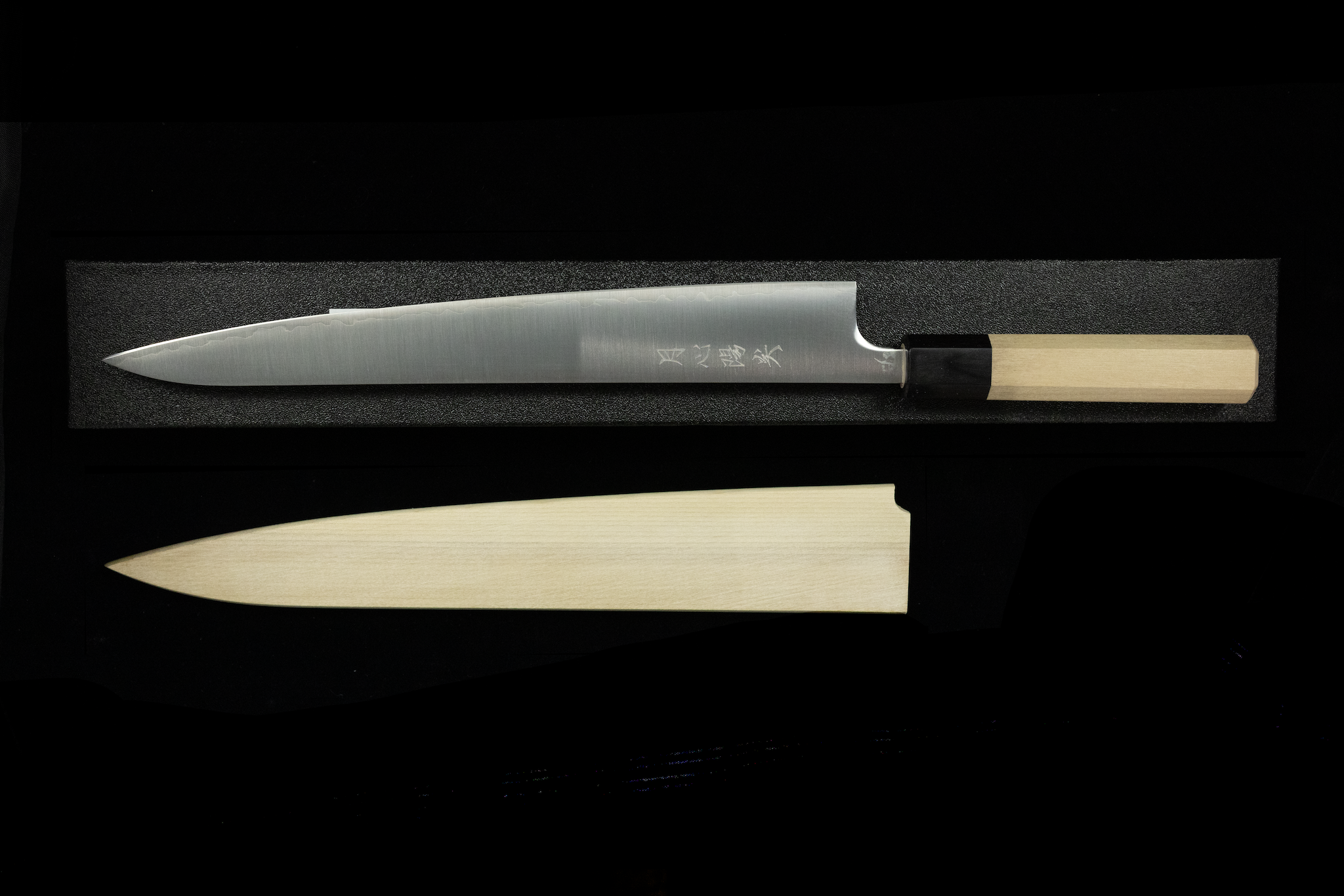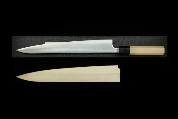 Gesshin Kagero knives are constructed with a stainless powdered steel core and softer stainless cladding. They have very good edge retention and take a very good edge. These knives have a really nice distal taper, rounded spine and choil, and good edge geometry. They are not as brittle as some other powdered steels, such as SG1 or SG2, but have equal (and sometimes better) edge retention. They are also pretty easy to sharpen. The wa-handled versions feature ho wood octagon handles and come with ho wood saya.