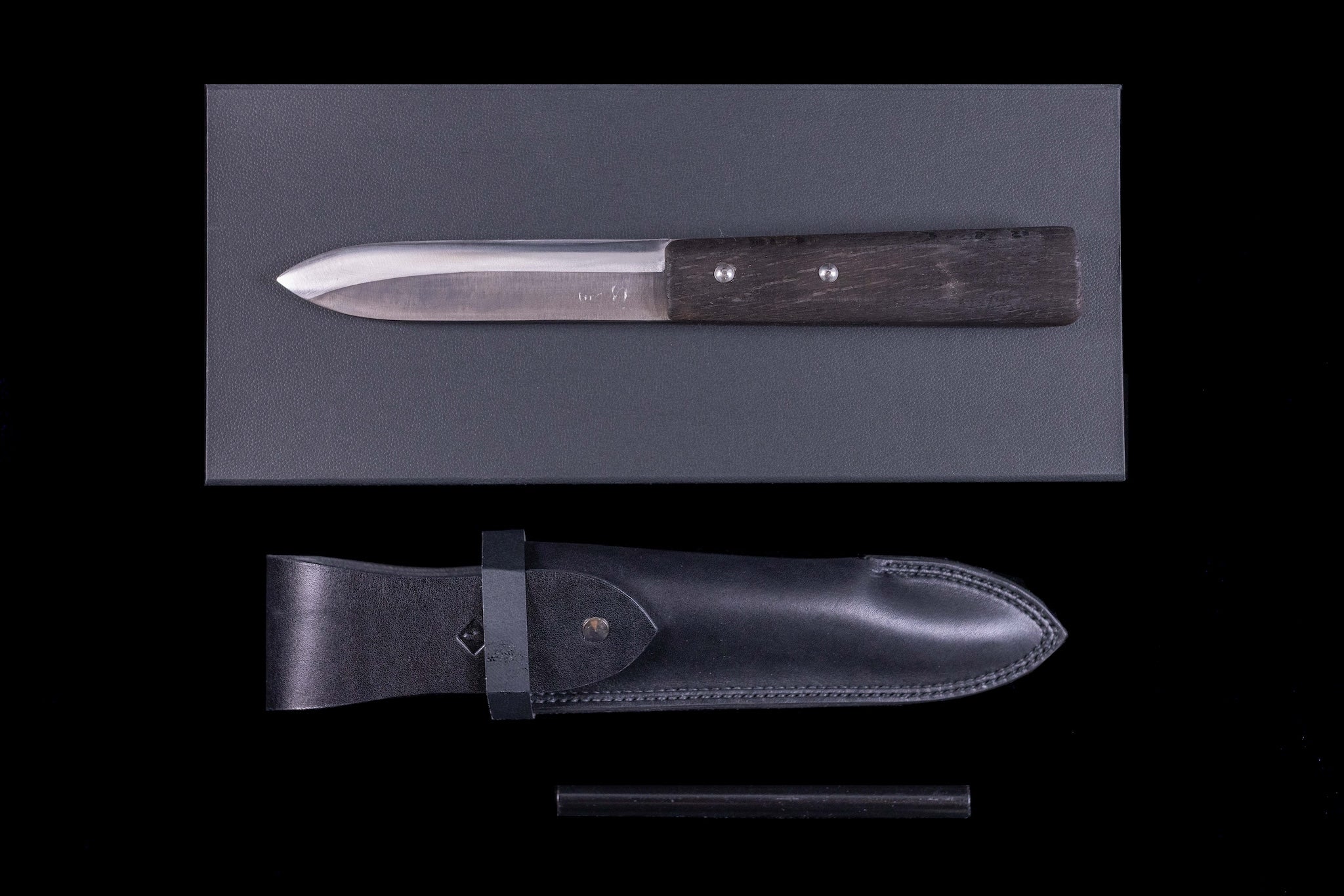 Our Gesshin Magomitsu makiri come with robust and very well-made, black, vegetable-tanned leather sheaths. Double-stitched, riveted, and thick, it can withstand the rigors of an outdoor lifestyle. No doubt, it will patina and look better over time. It also has an interesting design for the belt loop; it doubles as the locking mechanism for the knife. The belt loop swivels over the top of the handle to lock it in place while the knife is worn on-belt. To access the knife, rotate the sheath and pull the knife out.