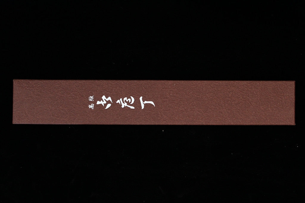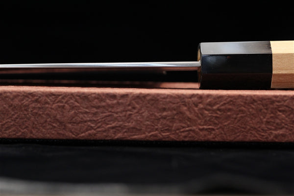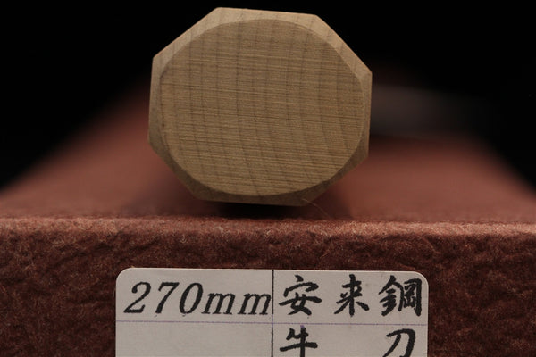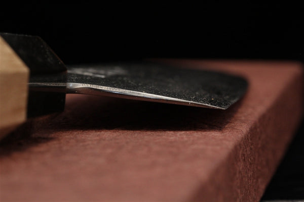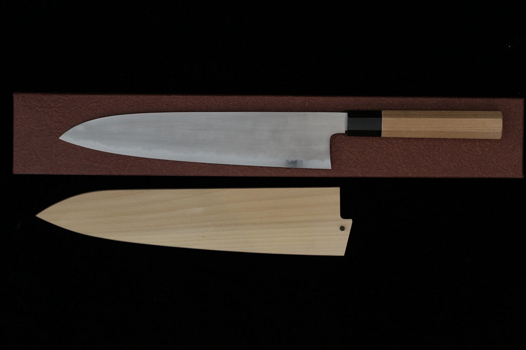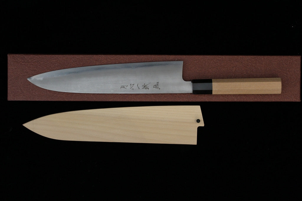 This Gesshin Ittetsu 270mm White #2 Hon-Kasumi Wa-Gyuto comes with a ho wood octagonal handle and matching saya. The sides of this knife have a misty white polish and the core steel can be seen in a slightly more polished finish near the edge. When visiting Ittetsu last year, we saw this kind of finish on some knives in their workshop and asked if we could have some made. The knife is also on the thinner side of what we normally see with hand forged clad knives. The profile and grind are very nice and the polish is really facinating.