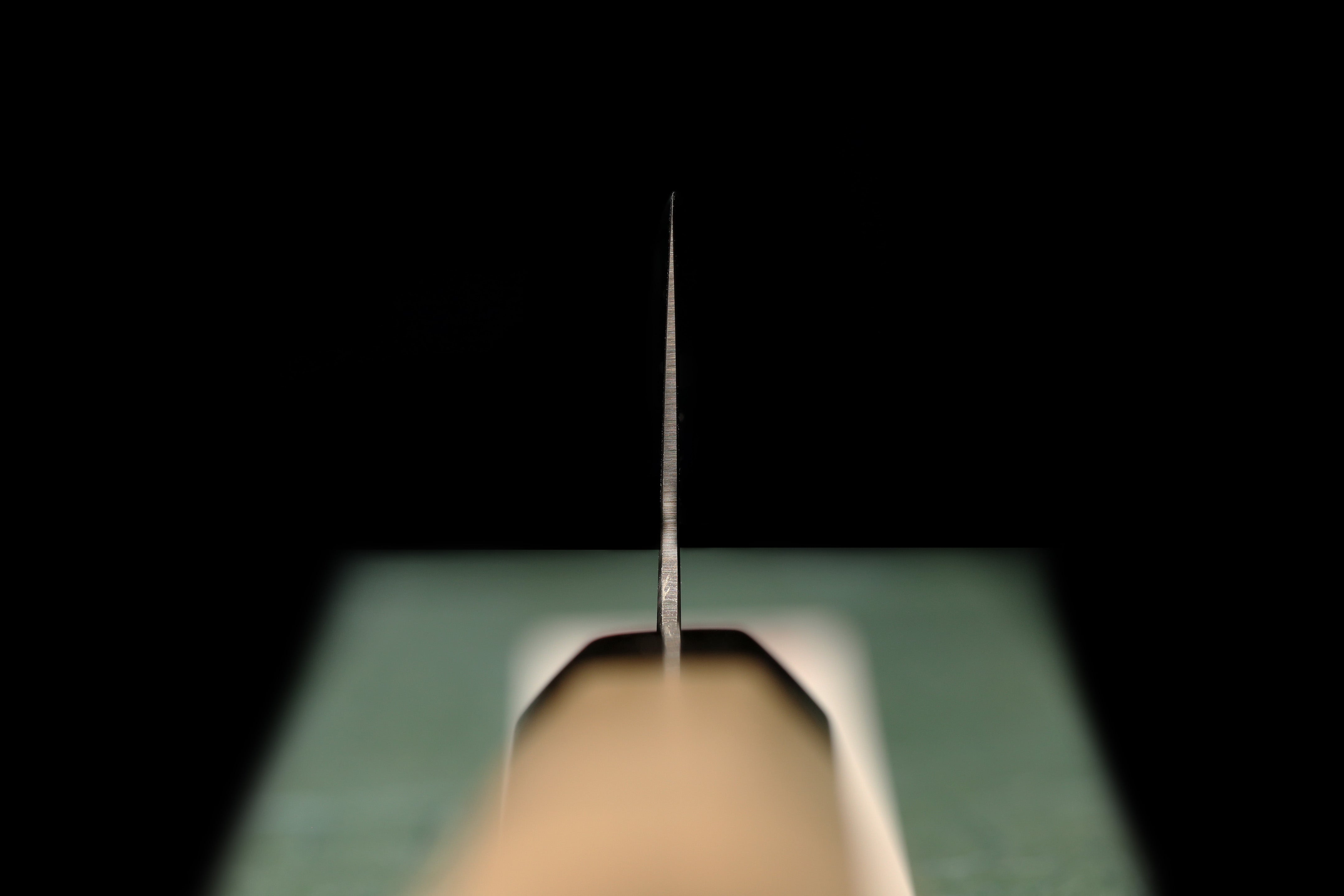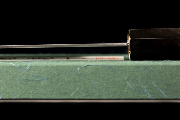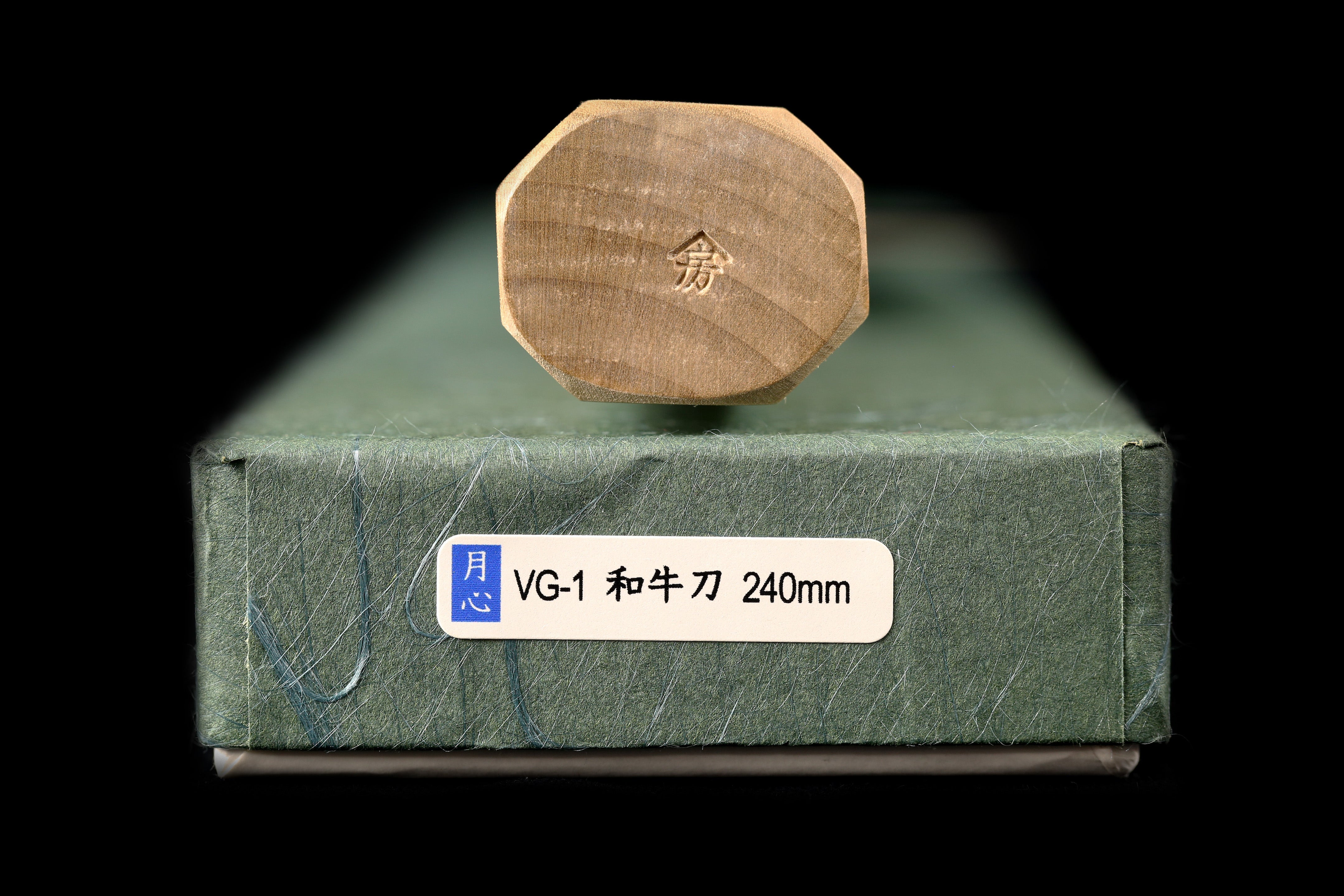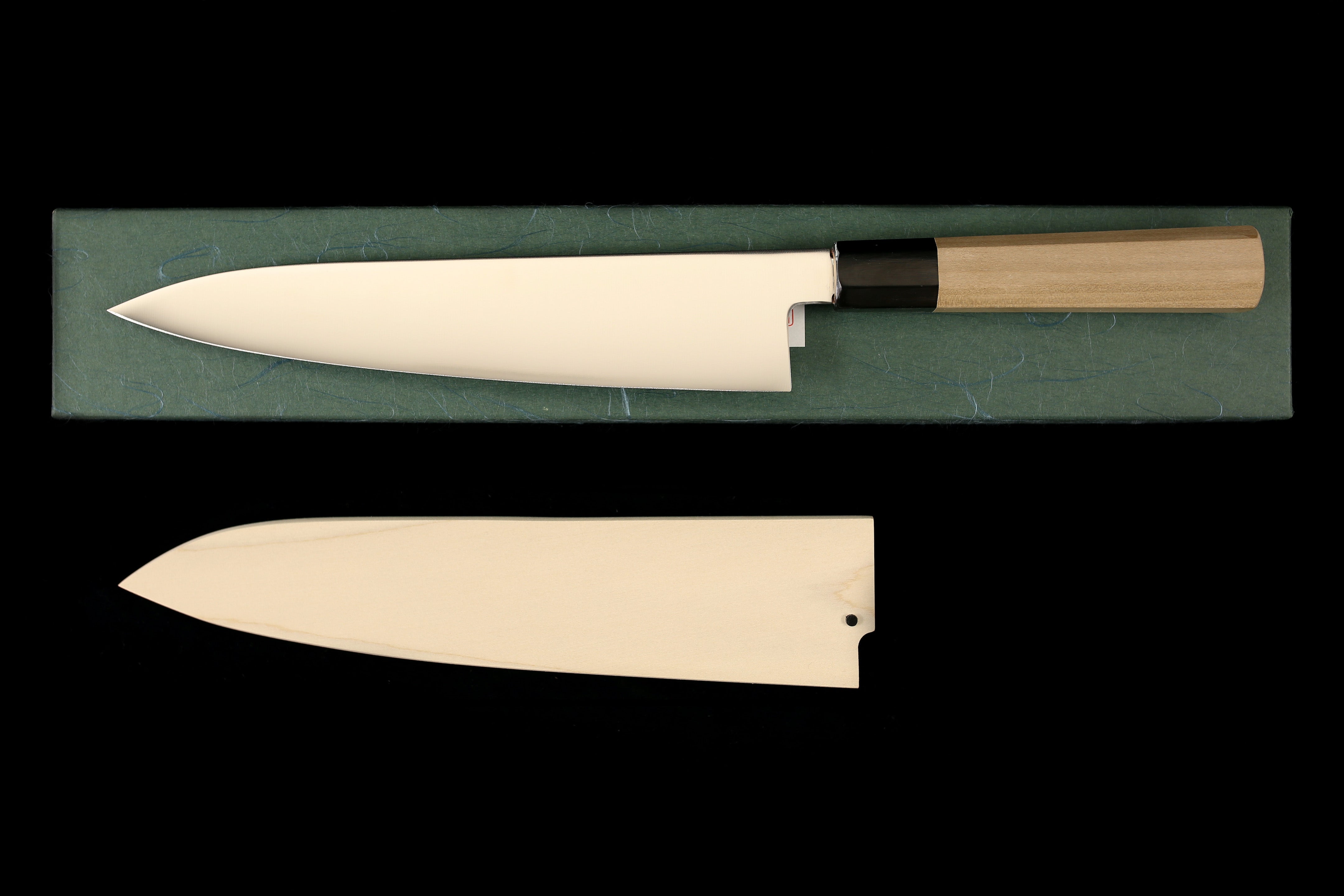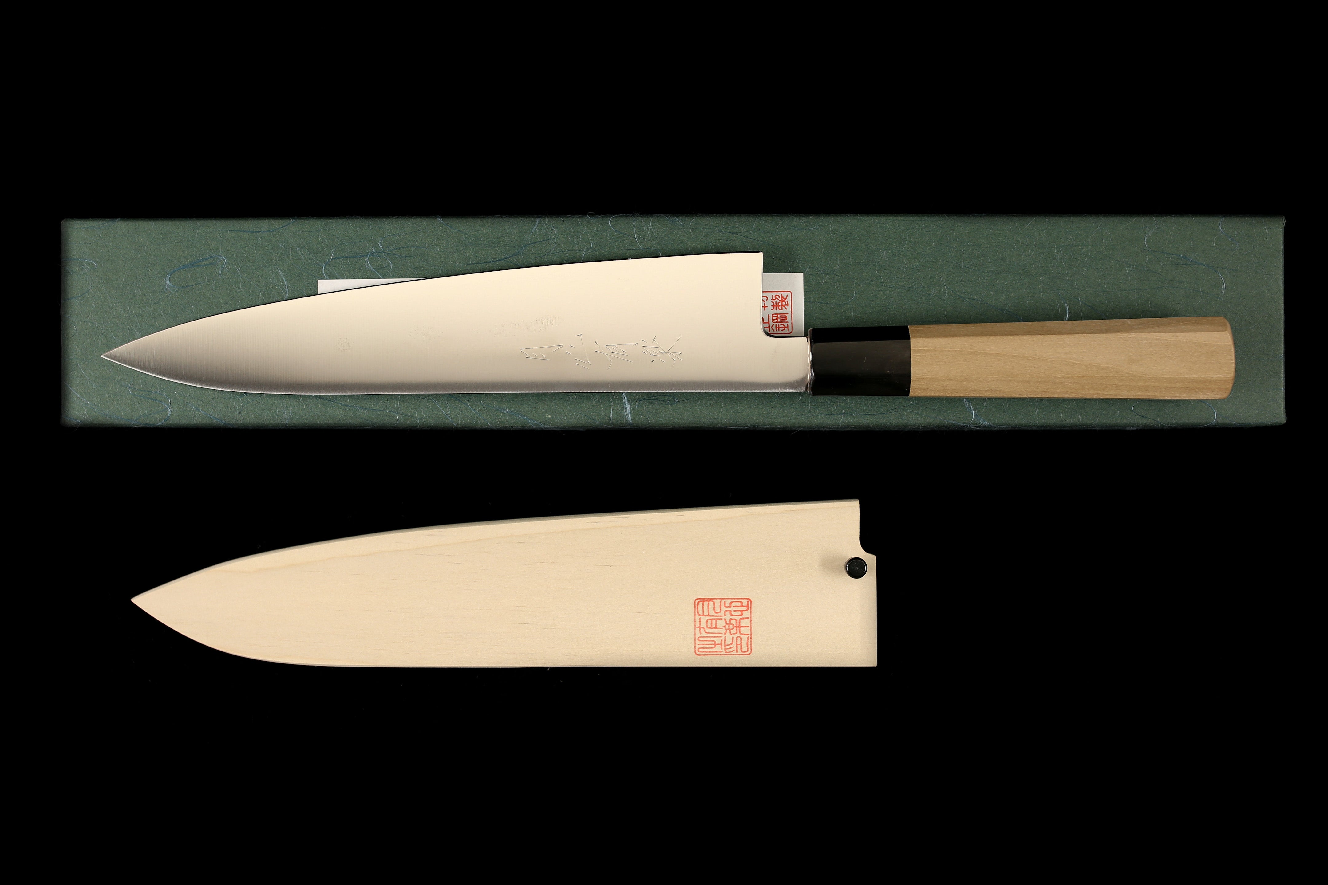 Our Gesshin Uraku line represents a great value in kitchen cutlery. This is one of our best-selling lines. Not too thin, but not thick either. Not too hard or soft. These knives are suitable for both professional and home cooks alike. They are very chip-resistant, stainless, and lightweight. They come with very nice octagonal handles and matching saya. The VG1 series is thinner (especially in the middle and behind the edge) than the standard Gesshin Uraku series and the steel type is different. They are VG1 at about 60hrc. The changes in the steel, heat treatment, and grind help these knives move through food more easily, sharpen more easily, and hold their edge longer. They are still very tough and durable, but slightly less so than the normal Gesshin Uraku series. The handles on these knives come with either black, marble, or blonde buffalo horn. We cannot take specific requests, but feel free to check with us about what we have in stock.