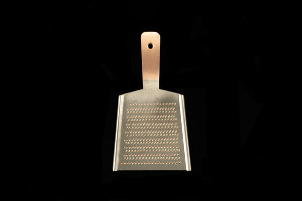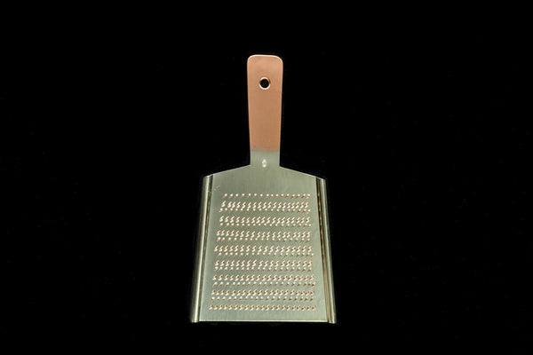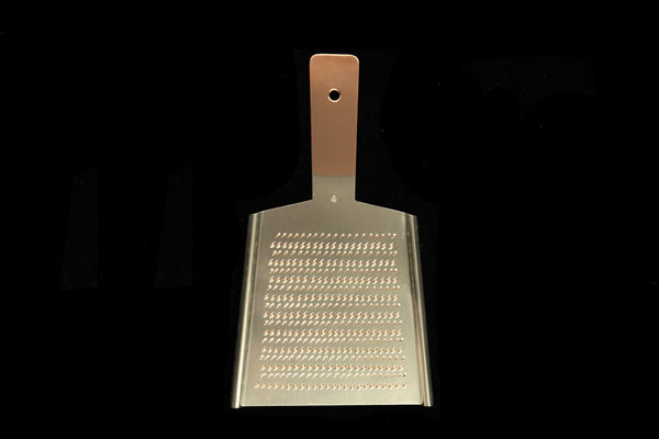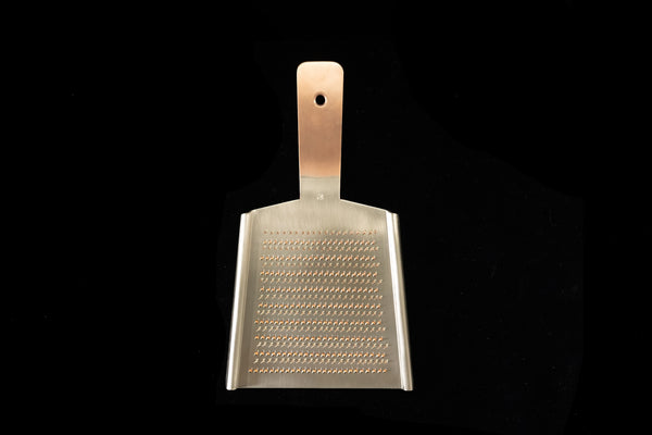 These handheld graters are designed to grate, mince, and puree foods like garlic, ginger, daikon, etc. They are made of a solid piece of copper and coated in tin and the tines are gouged by hand through the use of special tools. One side is coarse and the opposite is fine. To collect the food from the surface, the tines can be brushed with a hake and then rinsed with warm water and soap. Pat or air dry. Do not put in the dishwasher. The exposed copper will begin to oxidize with normal use.