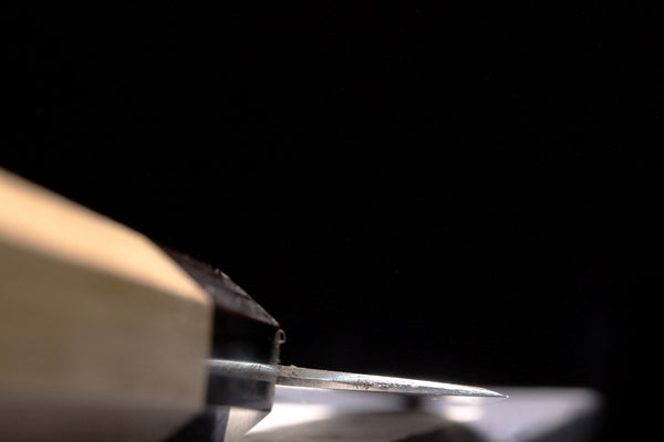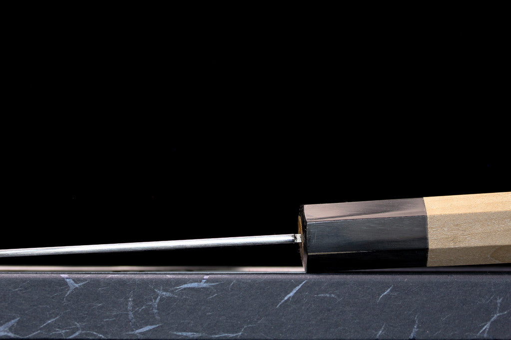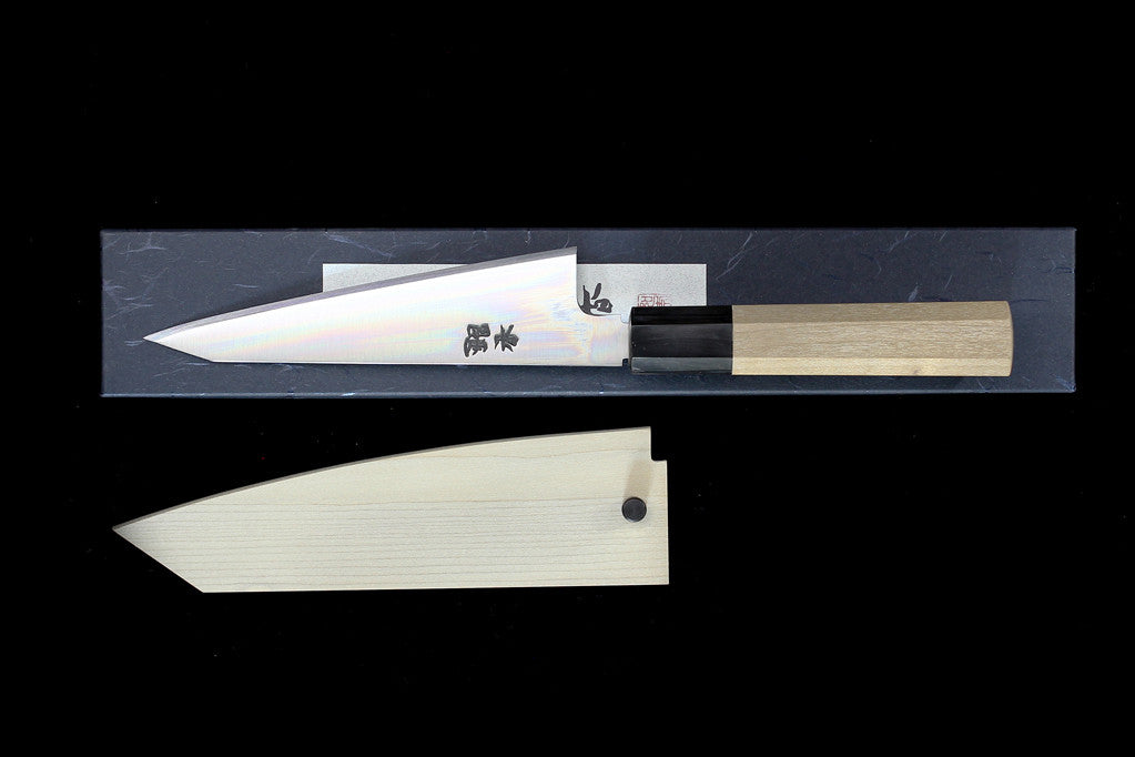 The Gesshin Ginga line is a custom line we have produced for us exclusively. These knives are very thin and light and have great fit and finish. The spine and choil are rounded and polished. The steel is a very fine-grained stainless steel hardened to about 61HRC. These knives take a great edge, sharpen easily, resist chipping well, and have great cutting performance due to their awesome geometry.