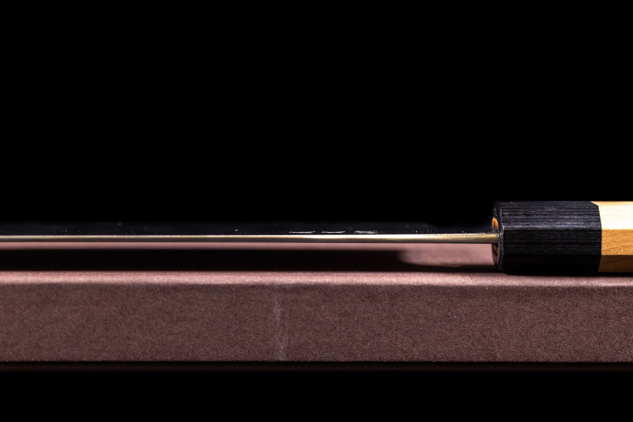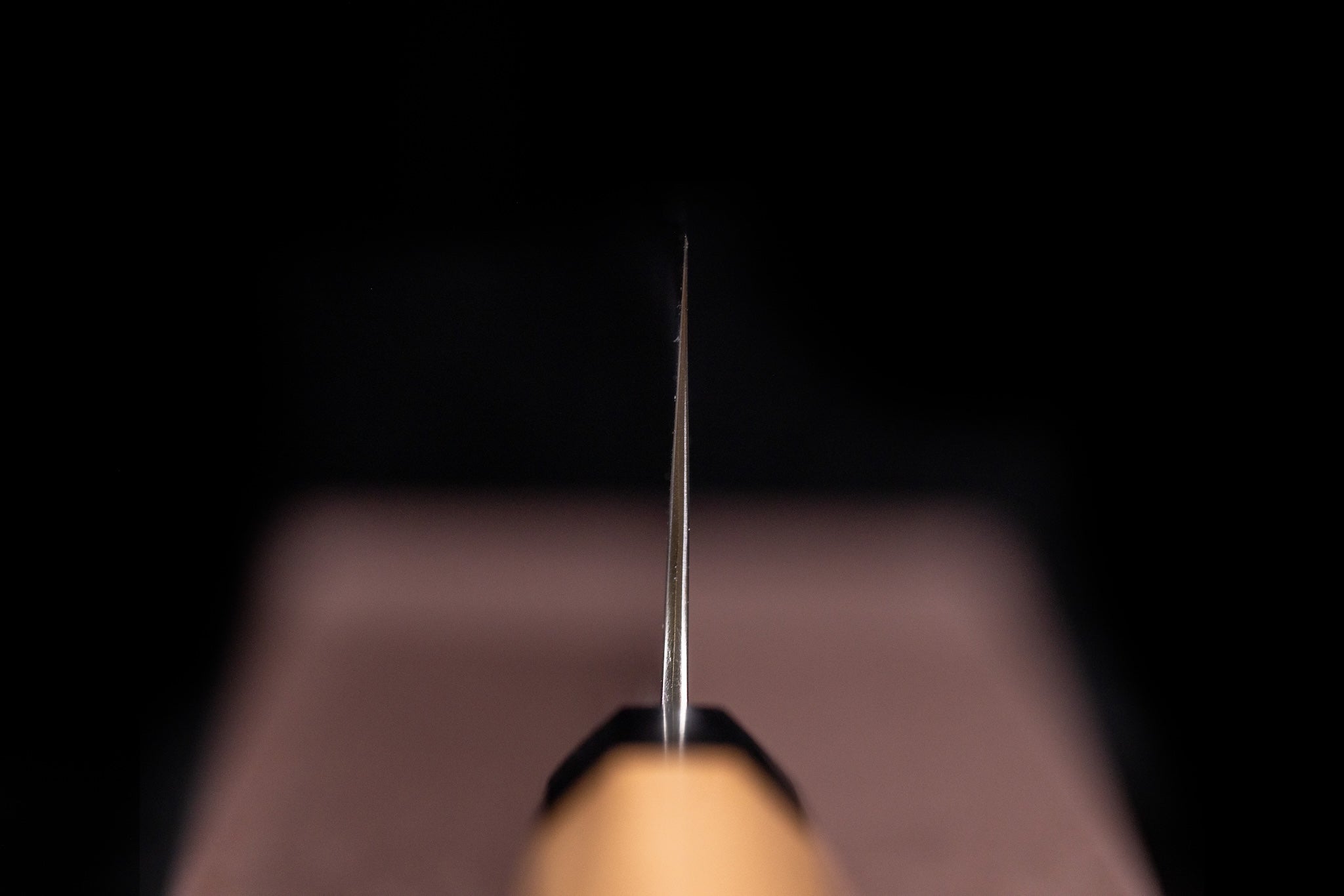 These knives have an excellent profile, grind, and distal taper, as well as clean fit and finish. Both the kurouchi and migaki models are clad in stainless steel. The stainless cladding reduces the reactive surface area of the knives to the few millimeters in between the cutting edge and lamination line.