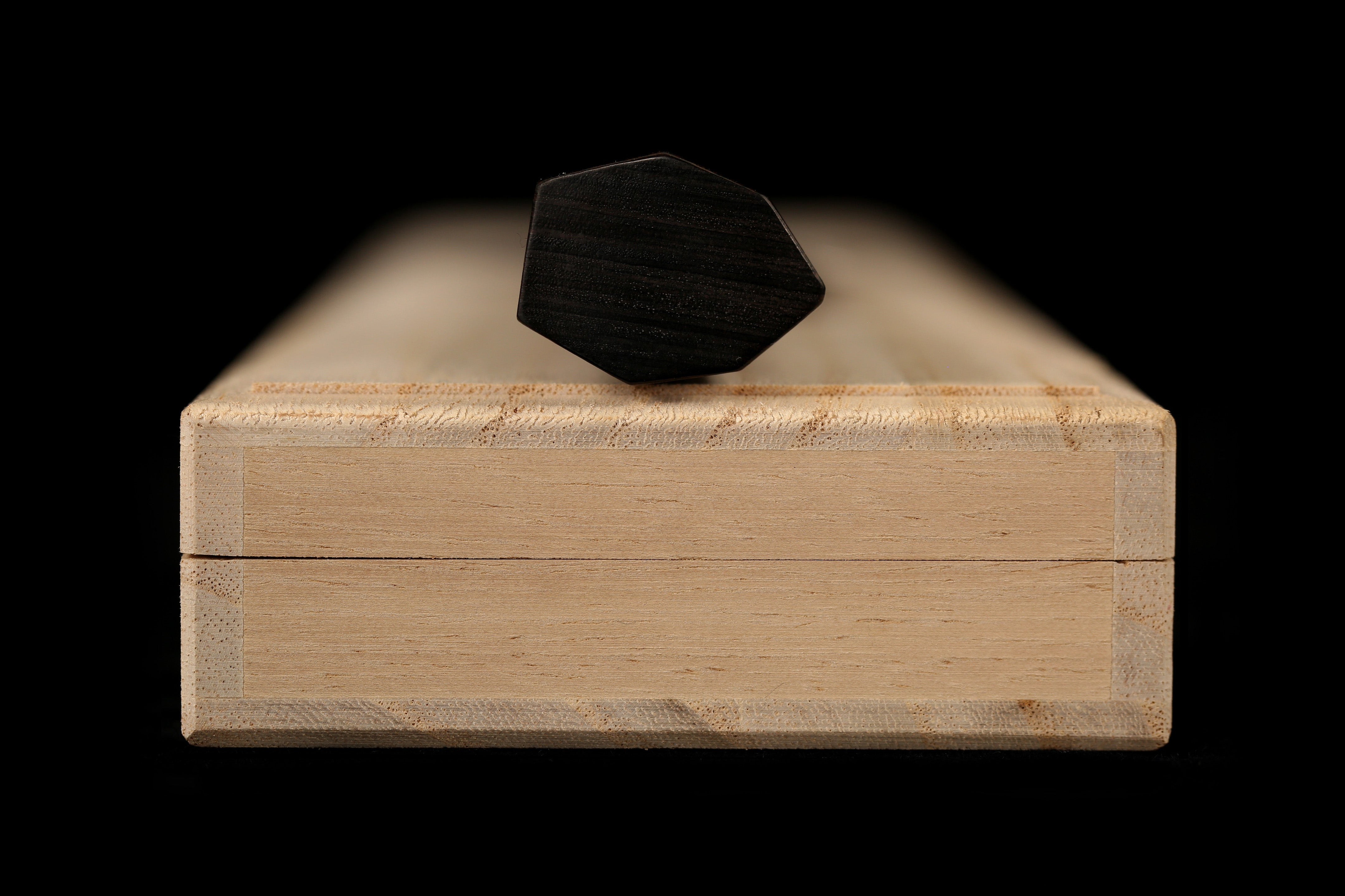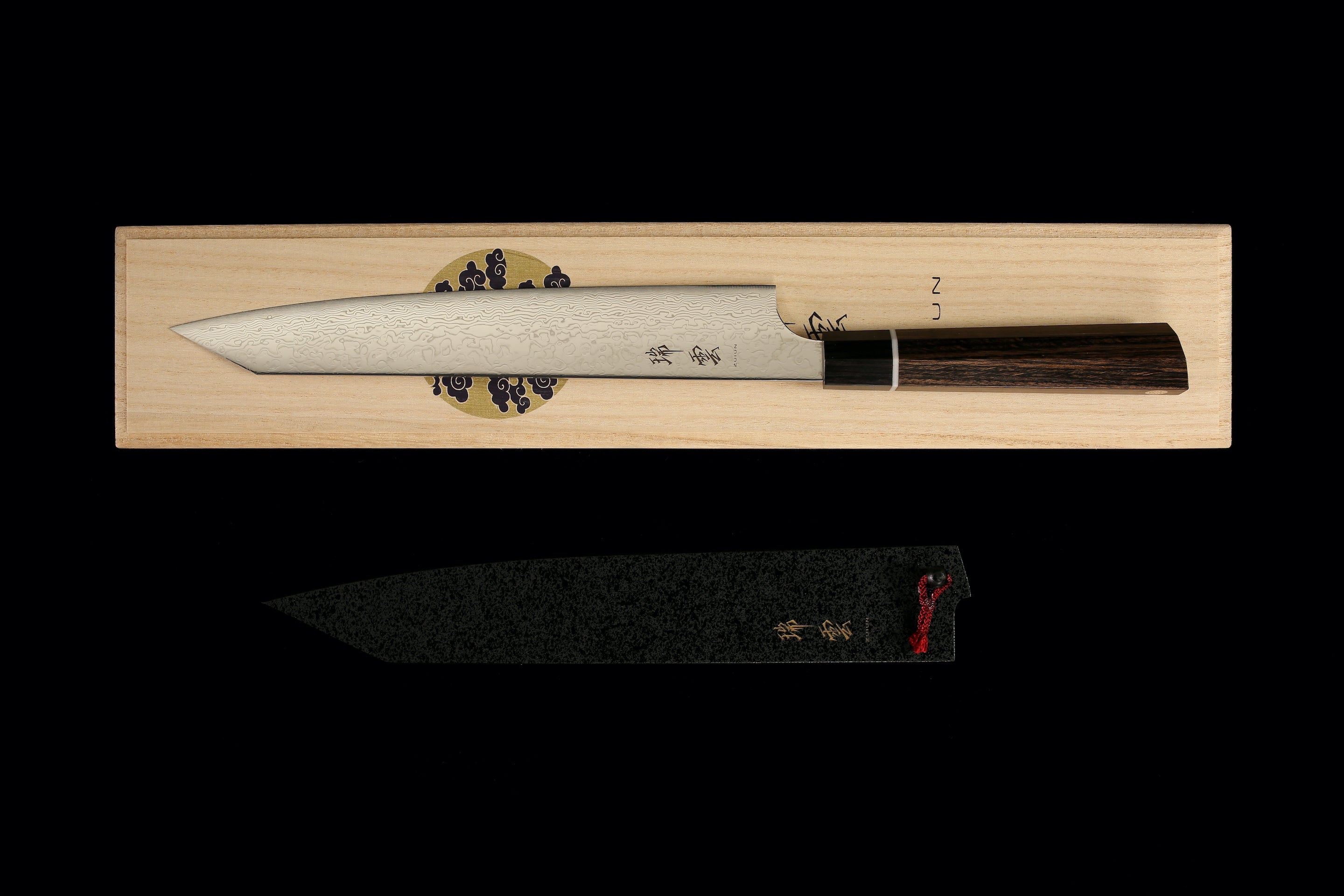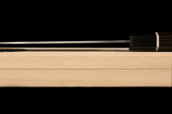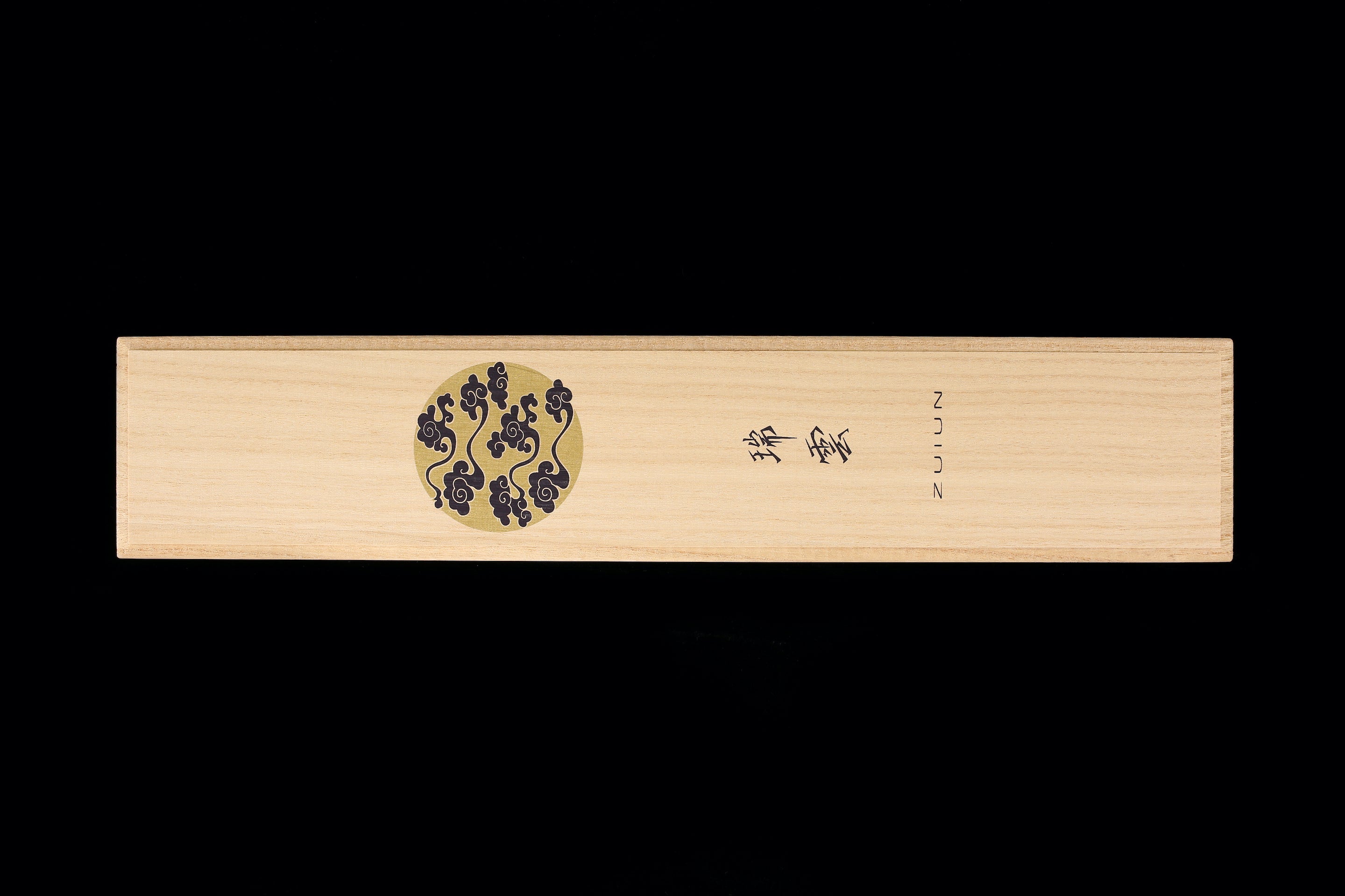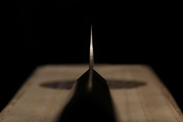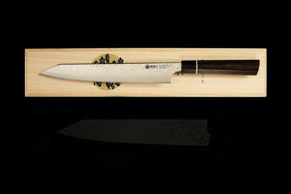The Shiun line is a series made in the Seki City by Seki Kanetsugu. They feature a VG10 core at about 60hrc, with stainless tsuchimne (hammered) cladding. These are relatively easy to sharpen and are pretty thin, but aren't quite as brittle as some of the harder knives we carry. The Shiun series has a wide bevel design, which helps with food release. The upper section has a hammered finish with a smoke-like color to the finish. The handles are octagonal oak. These are great knives for people looking for thin stainless knives with good food release. They will have better edge retention than softer steels like AUS8, but won't be as brittle as harder steels like sg2, blue #1, or white #1.