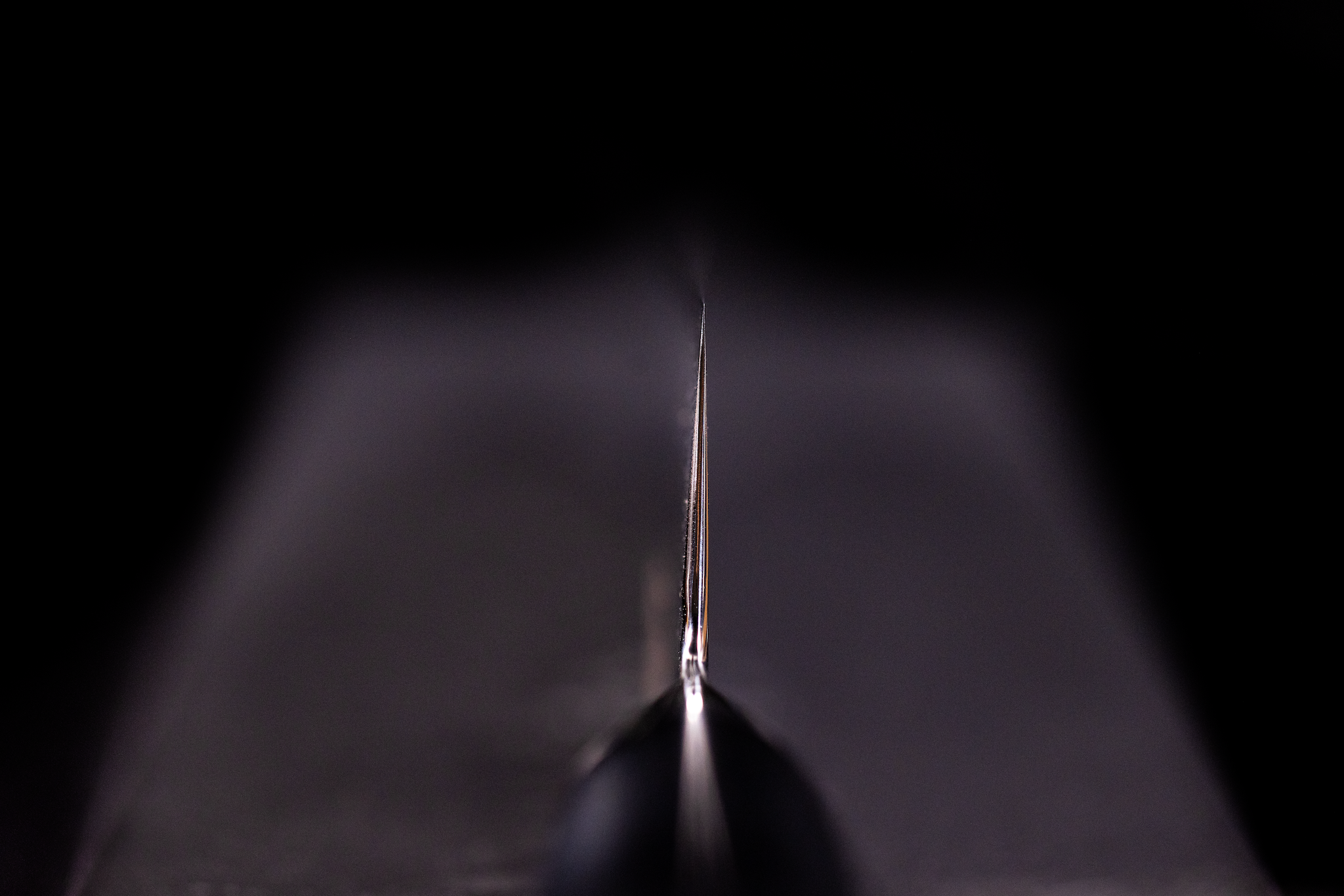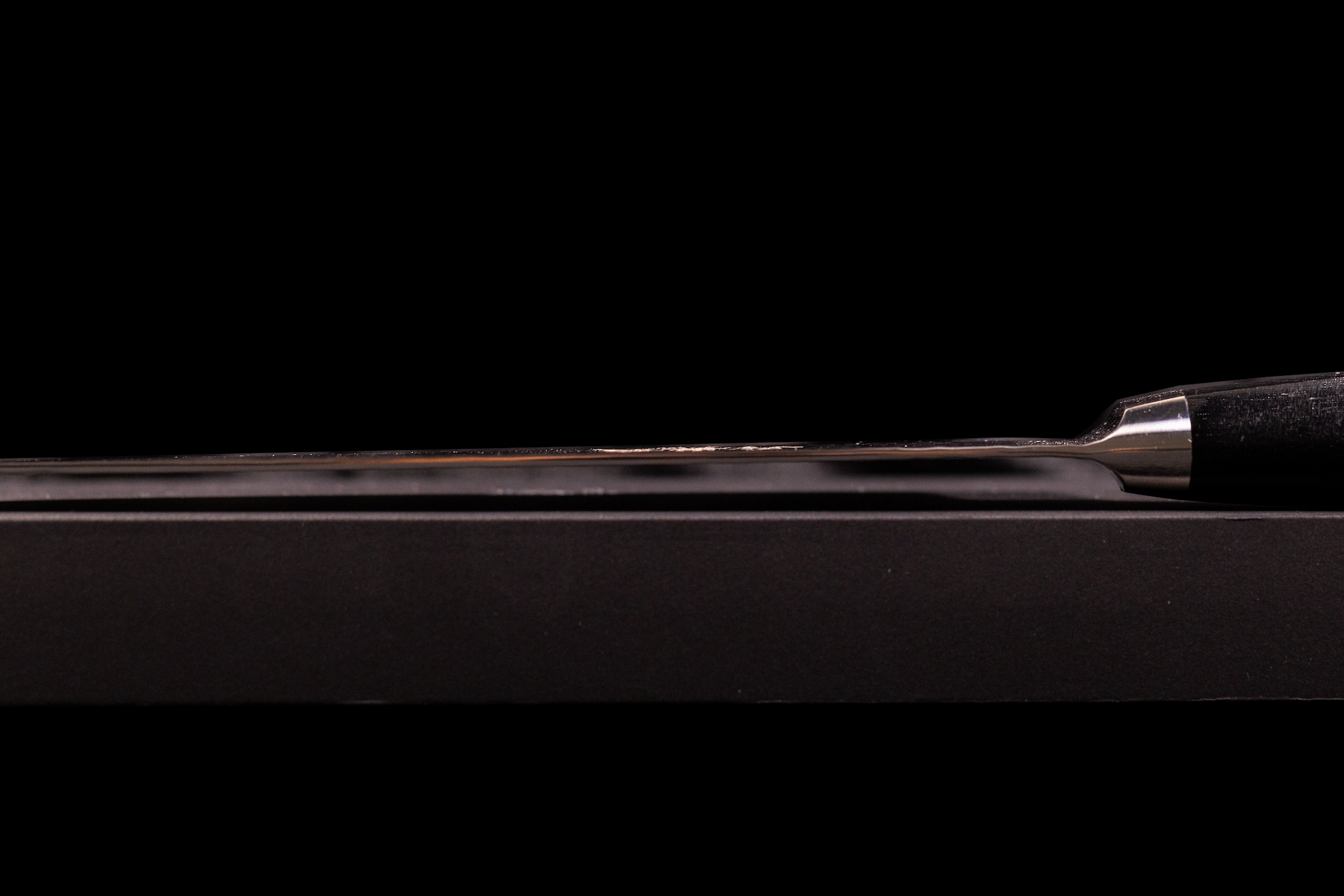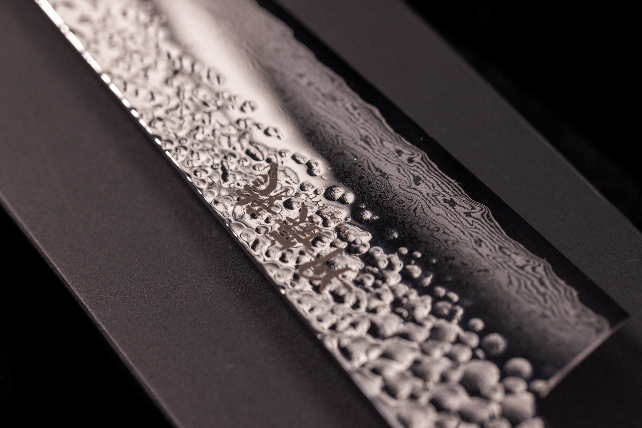 The Tanganryu series is relatively thin (not quite a laser, but close), with a medium/light weight. While they aren’t super lightweight in hand, they aren’t heavy, and despite is western handle appearance, the in-hand feel (along with the weight and balance) is much more similar to that of a Japanese style handle. The hammered damasucs finish is beautifully done, with a very high polish and exceptional fit and finish. Though it is primarily aesthetic, the hammered texture does help in food release. The blade profile, choil shape, and handle design have all been improved from previous runs to make the knife more comfortable in use. The choil shape sweeps away from the handle and the spine and choil are very nicely rounded and polished. The handle is crafted from a beautiful piece of maple, brought to an exceptionally high level of finish, and the shape makes the pinch grip extremely comfortable. No detail has gone unnoticed. The VG-10 core is exceptionally well heat treated, as they use molten salt baths in the process, which we agree is an excellent way to go about heat treating this steel. This series also comes with a black wood saya, featuring internal magnets to help keep the saya in place. This series won the 2016 Good Design Award.