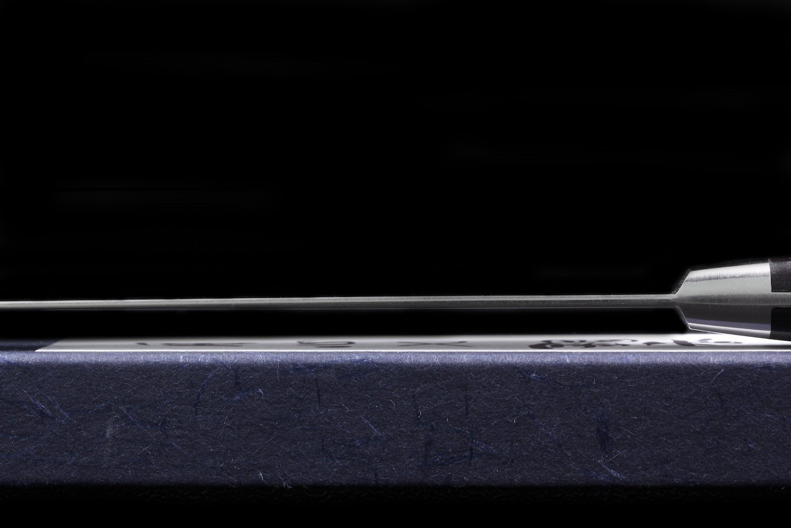 • The Gesshin Ginga line is a custom line we have produced for us exclusively. These knives are very thin and light and have great fit and finish. The spine and choil are rounded and polished. The steel is a very fine-grained stainless steel hardened to about 61HRC. These knives take a great edge, sharpen easily, resist chipping well, and have great cutting performance due to their awesome geometry