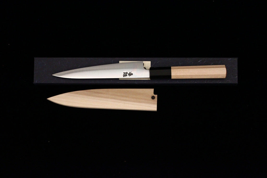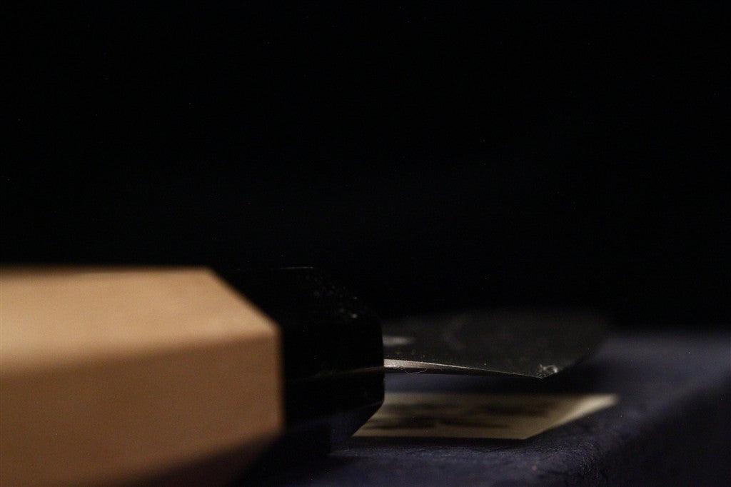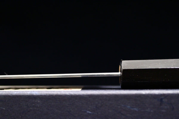 • The Gesshin Ginga line is a custom line we have produced for us exclusively. These knives are very thin and light and have great fit and finish. The spine and choil are rounded and polished. The white #2 steel (carbon steel) is very finely grained and hardened to about 61HRC. These knives take a great edge, sharpen easily, resist chipping well, and have great cutting performance due to their awesome geometry.