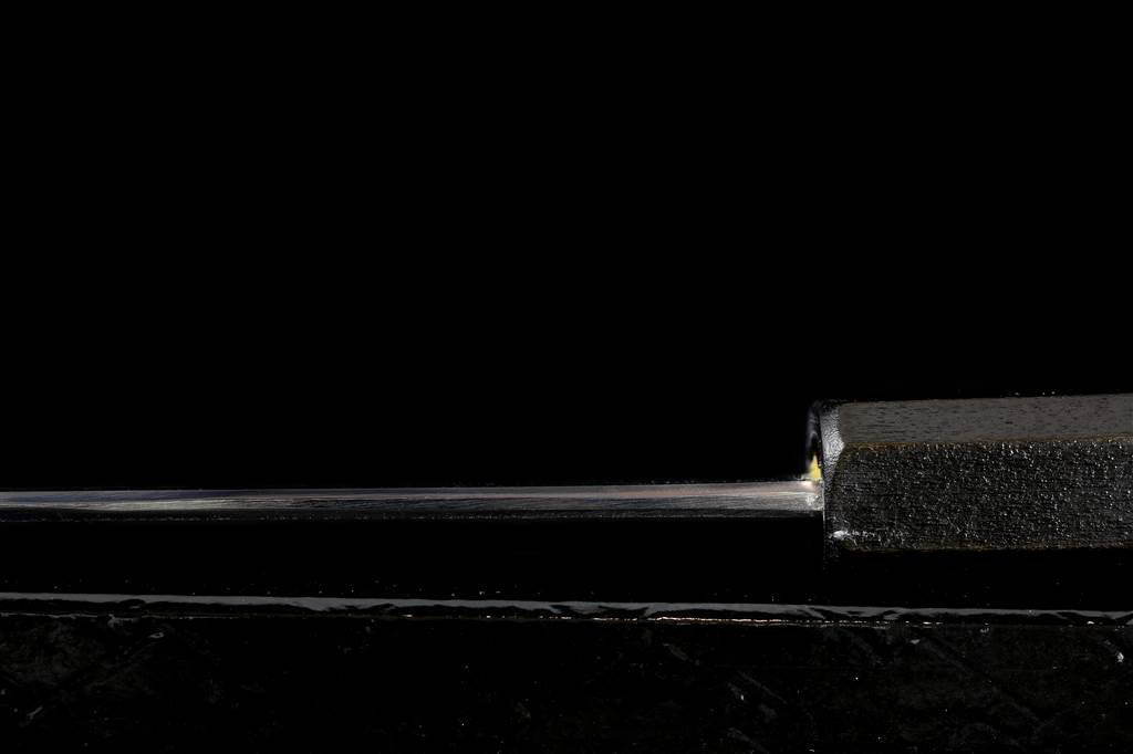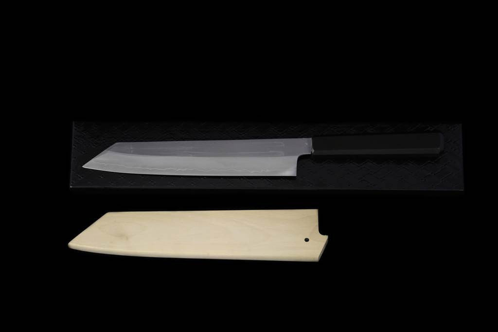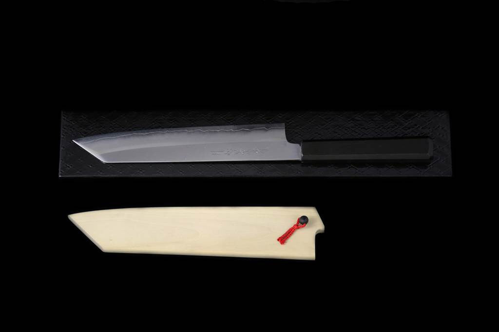 • These knives represent some of the highest level of craftsmanship and quality we have seen. The blacksmiths, sharpeners, and even lacquer-ware craftsmen are all amazingly skilled, as can clearly be seen by simply looking at them. In fact, all of the craftsmen are certified craftsmen or dentou-kougeishi (a very prestigious honor). These knives have amazing fit and finish, spectacular grinds, and amazing geometry. They are really thin behind the edge, have great distal taper, and wide bevels, making them easier to thin and sharpen. Unlike our higher end Gesshin Kagekiyo lines, these lacquer handles are far more simple, and the sayas that come with these are normal sayas instead of lacquered sayas.  The steels are also a bit more forgiving and easier to work with.