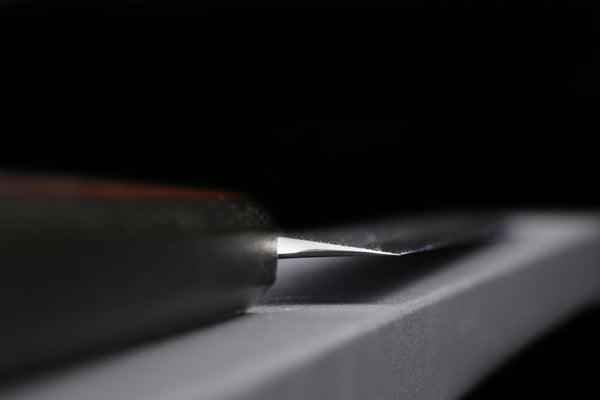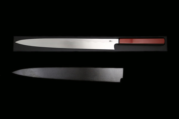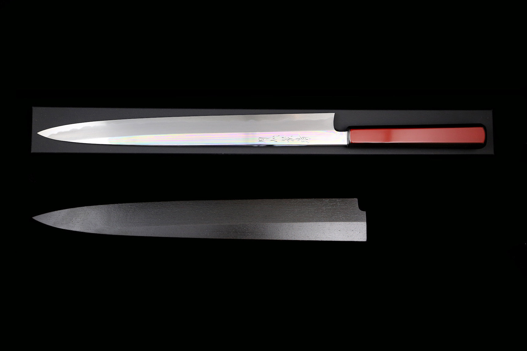 • We are proud to introduce our new Gesshin Kagekiyo series. This is something we have been working on for a few months now, together with one of our partners in Japan. Sara and I are very excited to finally be able to introduce it. These knives represent some of the highest level of craftsmanship and quality we have seen. The blacksmiths, sharpeners, and even lacquer-ware craftsmen are all amazingly skilled, as can clearly be seen by simply looking at them. In fact, all of the craftsmen are certified craftsmen or dentou-kougeishi (a very prestigious honor). These knives have amazing fit and finish, spectacular grinds, some of the most beautiful handles and sayas we've seen on Japanese knives, and amazing geometry. They are really thin behind the edge, have great distal taper, and wide bevels, making them easier to thin and sharpen. The lacquer craftsmen uses real lacquer on these, not synthetic lacquer as more commonly used. Even the boxes are beautiful lacquer-ware. We hope you guys are as excited as we are.