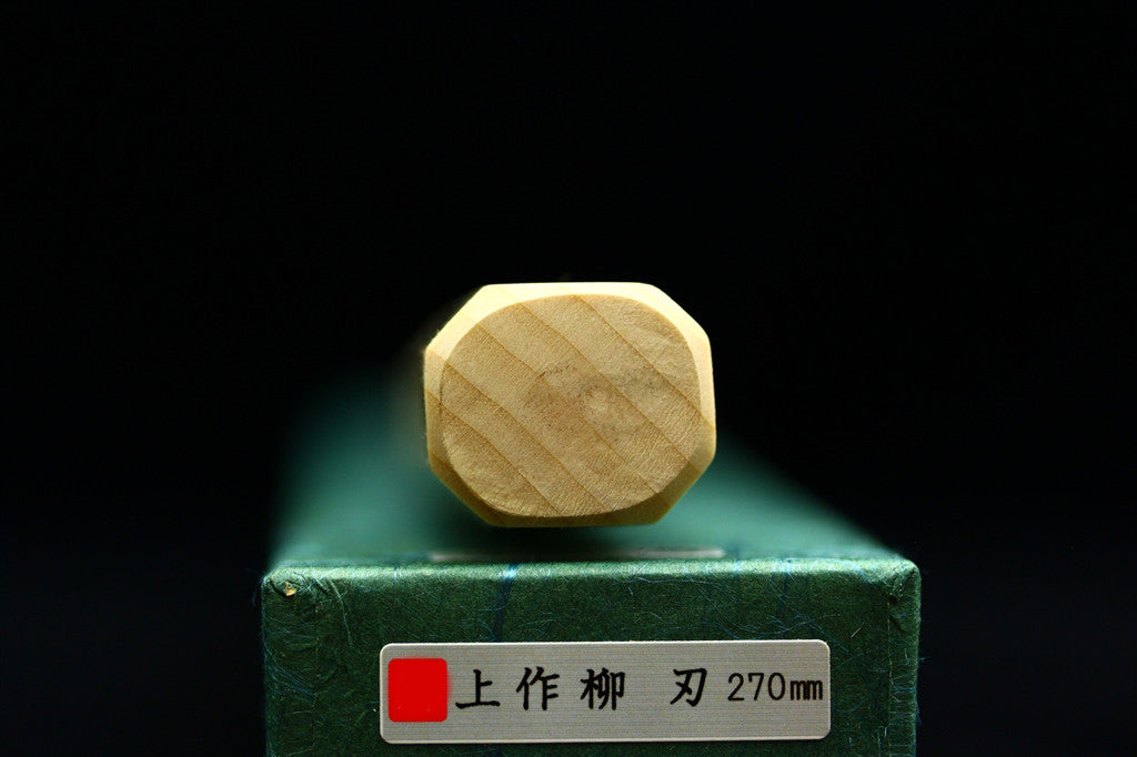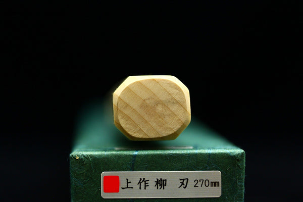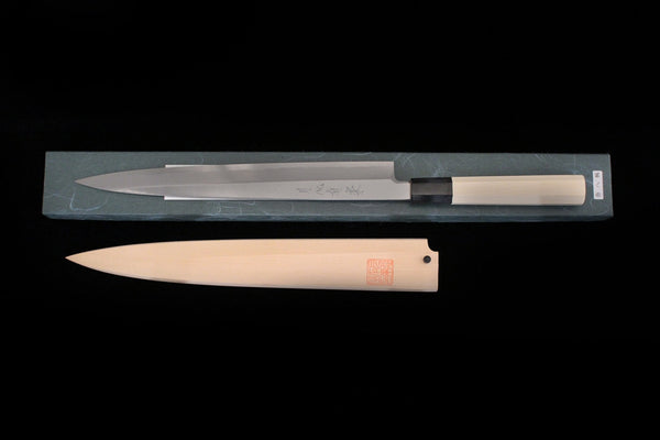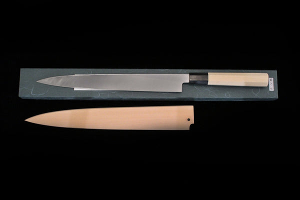 • Our Gesshin Uraku line represents a great value in kitchen cutlery. For a long time we have been searching for a line of single bevel knives with a great balance of quality and value. We’ve finally found them. This Gesshin Uraku line fits the bill perfectly. These knives are made of white #2 steel with a kasumi finish. They come with ho wood octagonal handles and matching ho wood sayas. Unlike many low cost single bevel knives, these ones are very well finished and have significantly less problems than lower cost knives (all knives have some imperfections, even high end knives, but these have fewer high and low spots, softened edges, less prevalence of wavy backs, less prevalence of torsional twisting, etc.)
