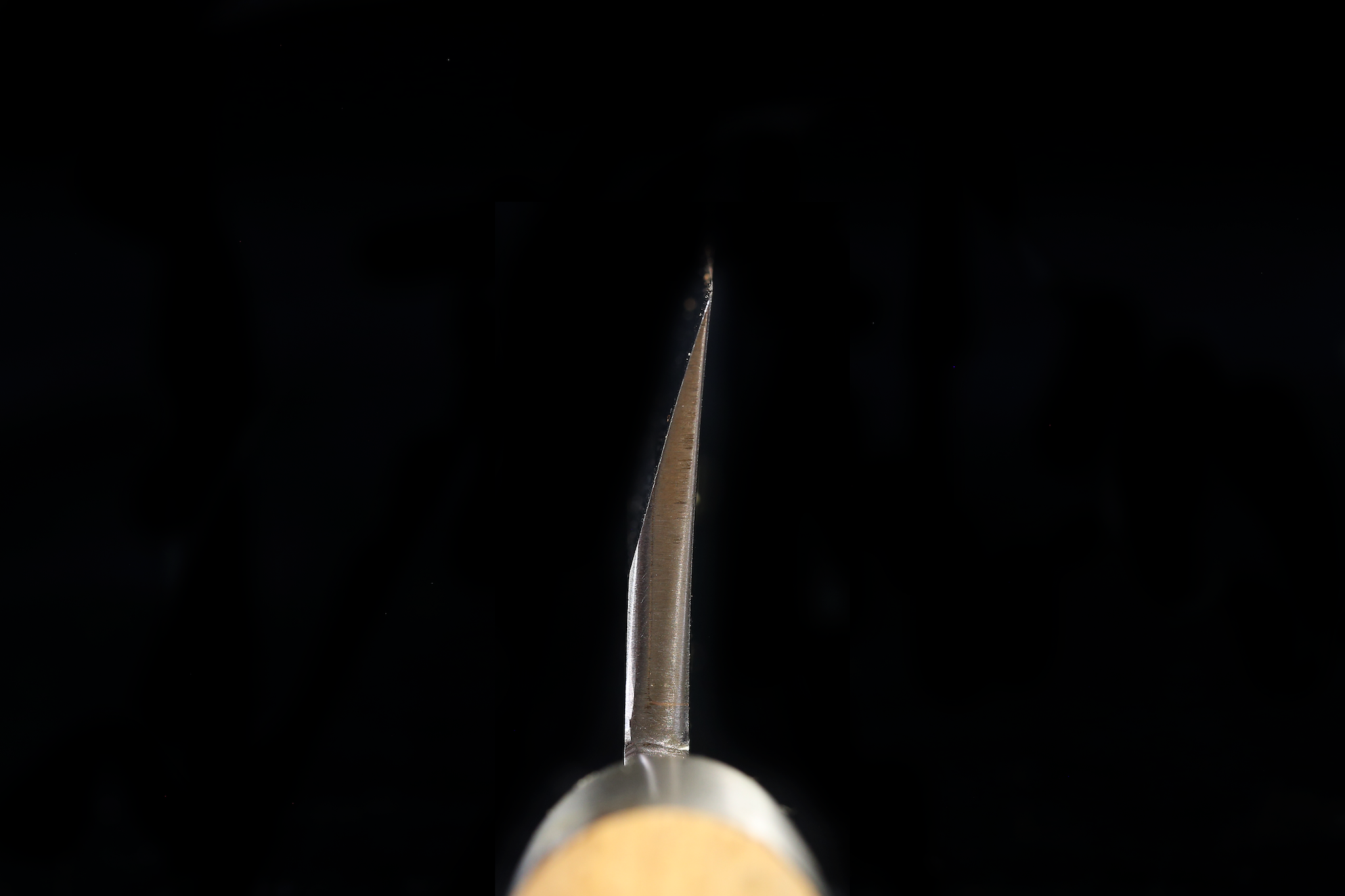• This high speed knife is one of a kind knife.  The maker of the Jin knives was born in Tokyo before World War II and began making knives early on in his life.  We met with him some years ago, during our first business trip to Japan.  After a very nice meeting with him, we were lucky enough to be allowed to carry his knives.  At the time we met him, he was already retired, so his knives are all new old stock (unused and new, but produced years ago).  Sadly, this craftsman passed away at the end of 2015.  He was a dear friend and is sincerely missed.  He is survived by his son, who, while also a craftsman, does not make knives.  As he is no longer producing knives, the inventory is EXTREMELY LIMITED.  Once things are gone, they are gone.