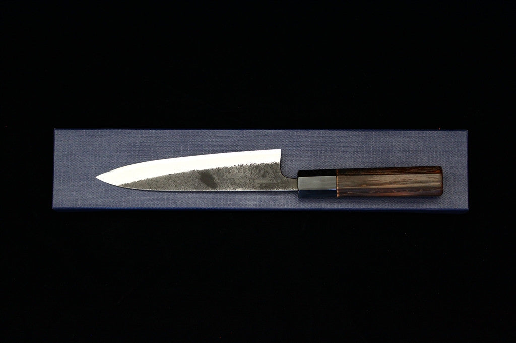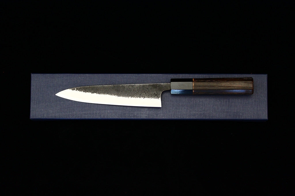 • The Kochi line is exclusive to Japanese Knife Imports.  These knives have a great in-hand feel... not too heavy, but not super light.  Near the spine they seem to be more substantial, however, behind the edge, the are EXTREMELY thin.  They are awesome cutters.  Near the heel, they have a nice flat spot, and towards the tip, a gentle curve.  The octagon burnt chestnut handles are very comfortable and retain grip very well when wet.  These are carbon knives, so they will need to be cared for as such.  They can rust if left wet and/or dirty and will develop a patina over time.  The cladding on these knives is reactive, but not as reactive as many I have seen.