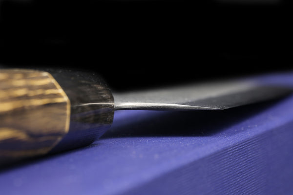 Kochi knives have a great in-hand feel- not too heavy, but not super light.  Near the spine they seem to be more substantial, however, behind the edge, the are EXTREMELY thin.  They are awesome cutters.  Near the heel, they have a nice flat spot, and towards the tip, a gentle curve. The octagonal burnt chestnut handles are very comfortable and retain grip very well when wet.  These are carbon steel knives, so they will need to be cared for as such.  They can rust if left wet and/or dirty and will develop a patina over time.  The cladding on these knives is reactive, but not as reactive as many I have seen.