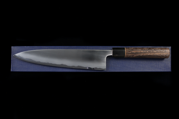 • The Kochi line is exclusive to Japanese Knife Imports.  These knives have a great in-hand feel... not too heavy, but not super light.  Near the spine they seem to be more substantial, however, behind the edge, the are EXTREMELY thin.  They are awesome cutters.  Near the heel, they have a nice flat spot, and towards the tip, a gentle curve.  The octagon burnt chestnut handles are very comfortable and retain grip very well when wet.  These are carbon knives, so they will need to be cared for as such.  They can rust if left wet and/or dirty and will develop a patina over time.  The cladding on these knives is reactive, but not as reactive as many I have seen.