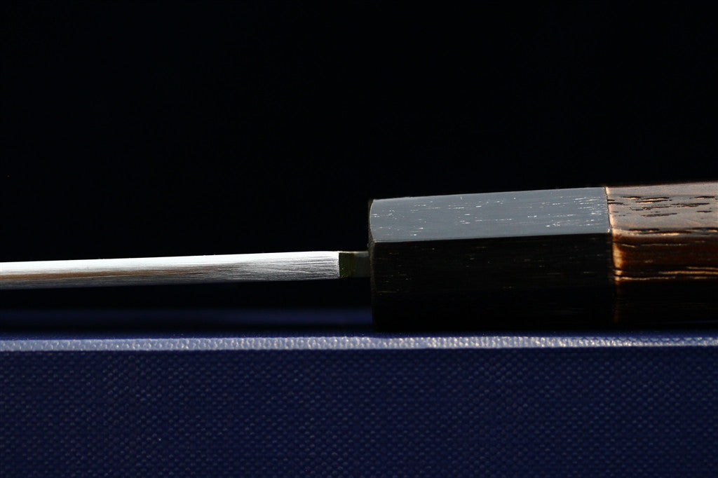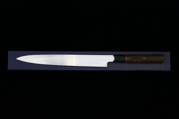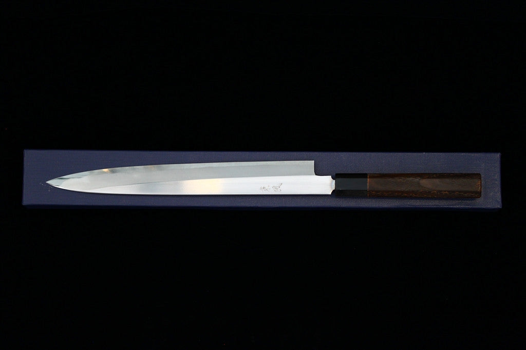 • The Kochi line is an exclusive to Japanese Knife Imports.  These knives have a great in-hand feel... not too heavy, but not super light.  The yanagiba is very nice and thin and the grind is very nice.  The blue #2 steel takes a very good edge and has very nice edge retention too.  The octagon burnt chestnut handles are very comfortable and retain grip very well when wet.  These are carbon knives, so they will need to be cared for as such.  They can rust if left wet and/or dirty and will develop a patina over time.  The cladding on these knives are reactive, but not as reactive as many i have seen.