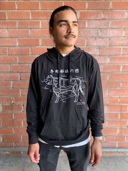 • These JKI Hoodies were designed by Sumiko Pogue and feature calligraphy by Hiroko Yamai. The front design shows the various Japanese-style cuts of the animals, with part names written in both Japanese and English. The back of the hoodie says "Los Angeles Specialty Kitchen Knife Store" in Japanese. They're made from 100% cottonThese are lightweight hoodies, comfortable to wear in cold-to-warm temperatures. Great year-round California weather hoodies.