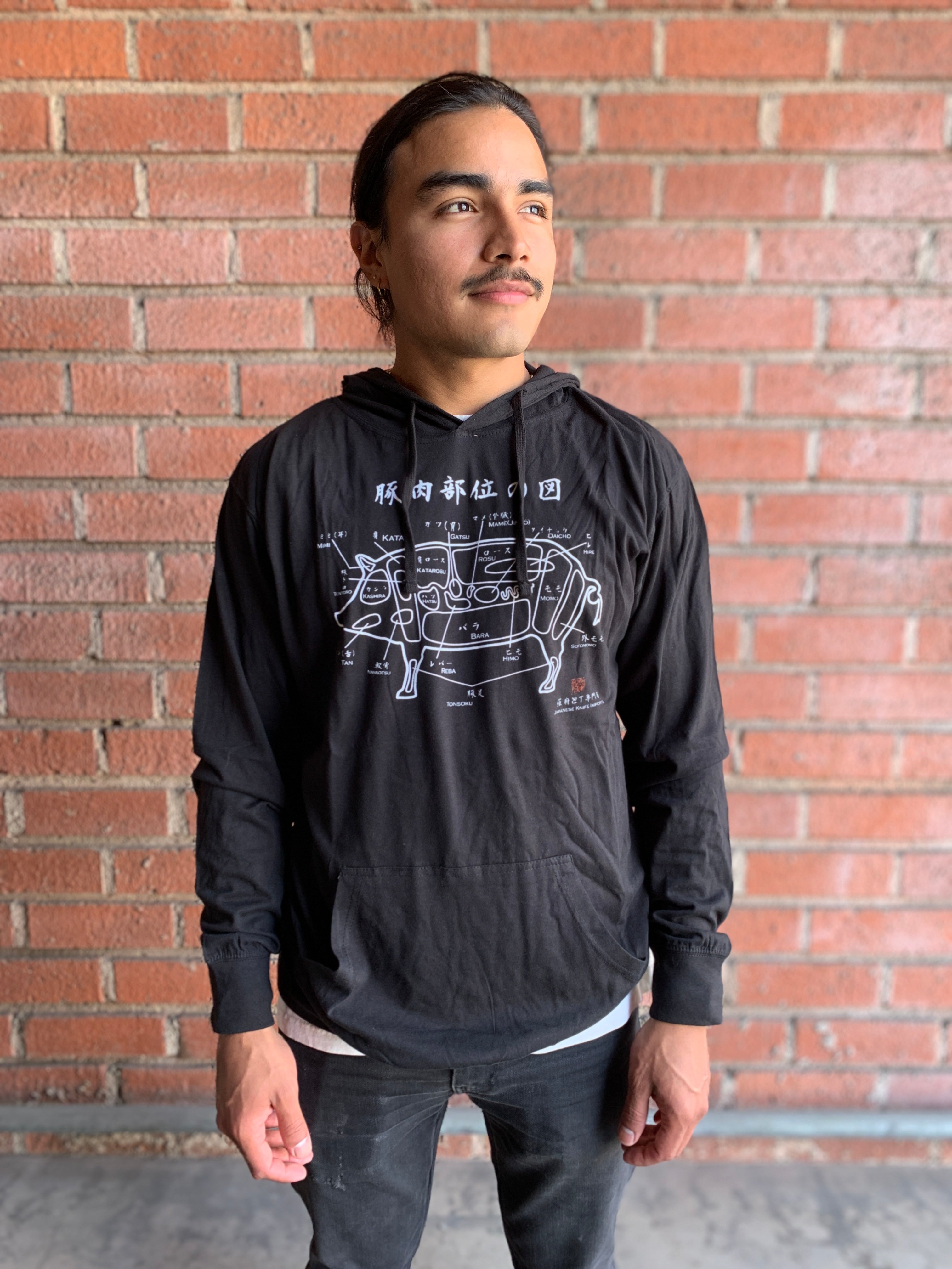 • These JKI Hoodies were designed by Sumiko Pogue and feature calligraphy by Hiroko Yamai. The front design shows the various Japanese-style cuts of the animals, with part names written in both Japanese and English. The back of the hoodie says "Los Angeles Specialty Kitchen Knife Store" in Japanese. They're made from 100% cottonThese are lightweight hoodies, comfortable to wear in cold-to-warm temperatures. Great year-round California weather hoodies.