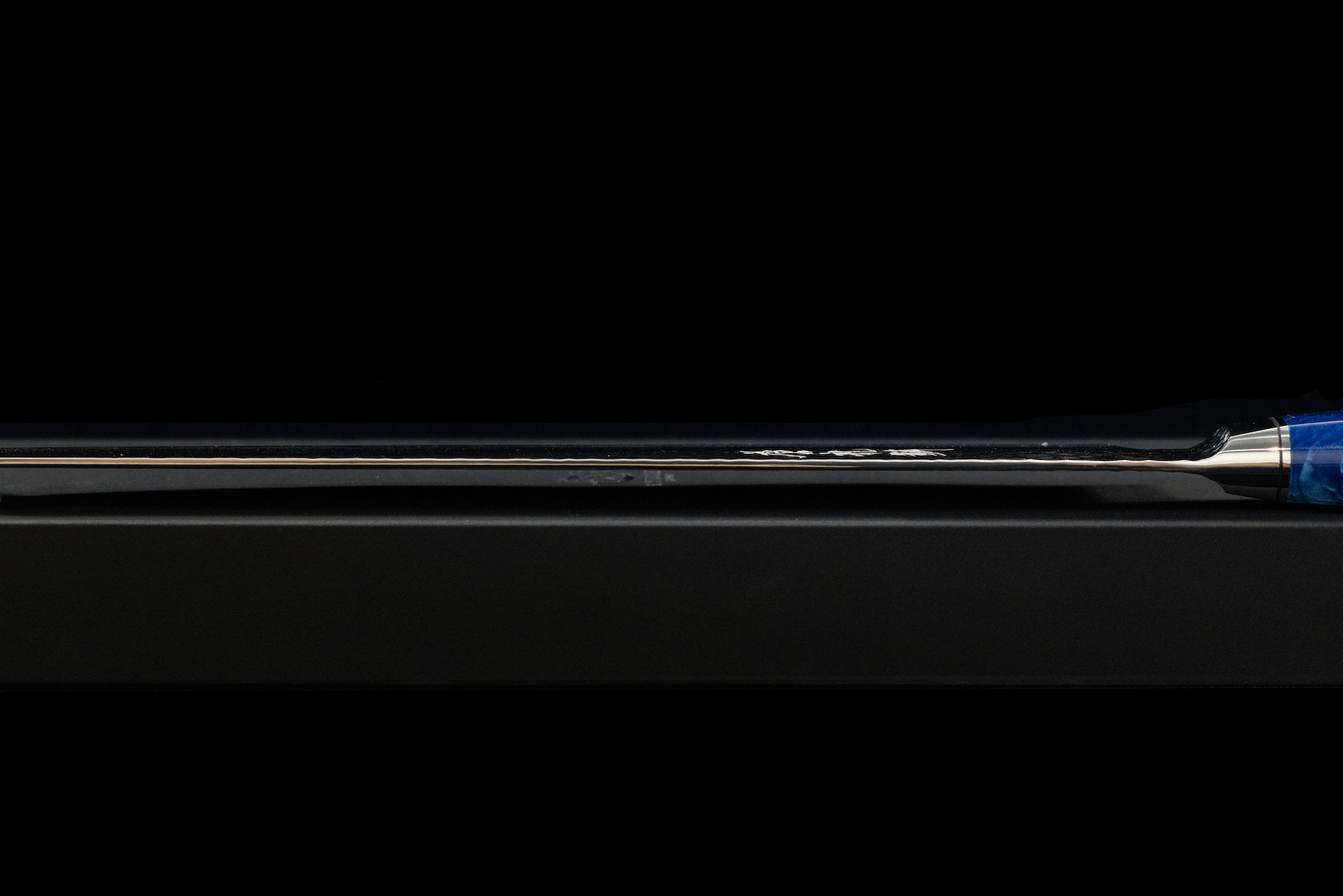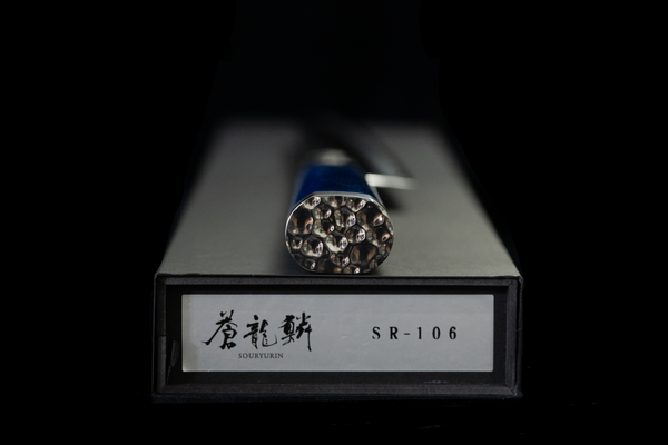 The Souryurin series is relatively thin (not quite a laser, but close), with a medium/lightweight. While they aren’t super lightweight in hand, they aren’t heavy, and despite is western handle appearance, the in-hand feel (along with the weight and balance) is much more similar to that of a Japanese-style handle. The hammered damascus finish is beautifully done, with a very high polish and exceptional fit and finish. Though it is primarily aesthetic, the hammered texture does help in food release. The blade profile, choil shape, and handle design mirror that of similar series they make, focusing on comfort in hand. The choil shape sweeps away from the handle and the spine and choil are very nicely rounded and polished. The blue resin handle has the appearance of dragon scales just under the surface, drawing upon the imagery of Seiryu- the legendary blue dragon. The tapered shape of the handle makes the pinch grip extremely comfortable. No detail has gone unnoticed. The VG10W core is exceptionally well heat treated, as they use molten salt baths in the process, which we agree is an excellent way to go about heat treating this steel. This series also comes with a black wood saya.