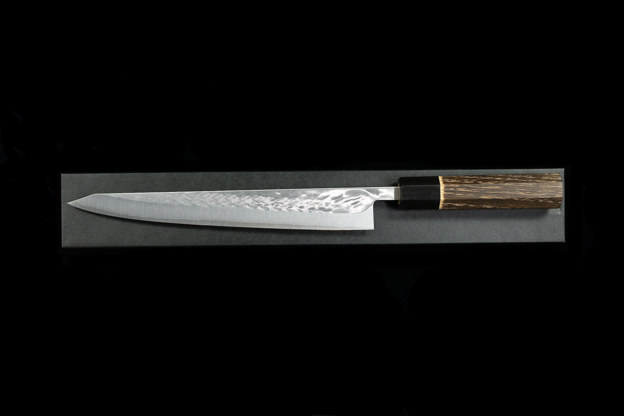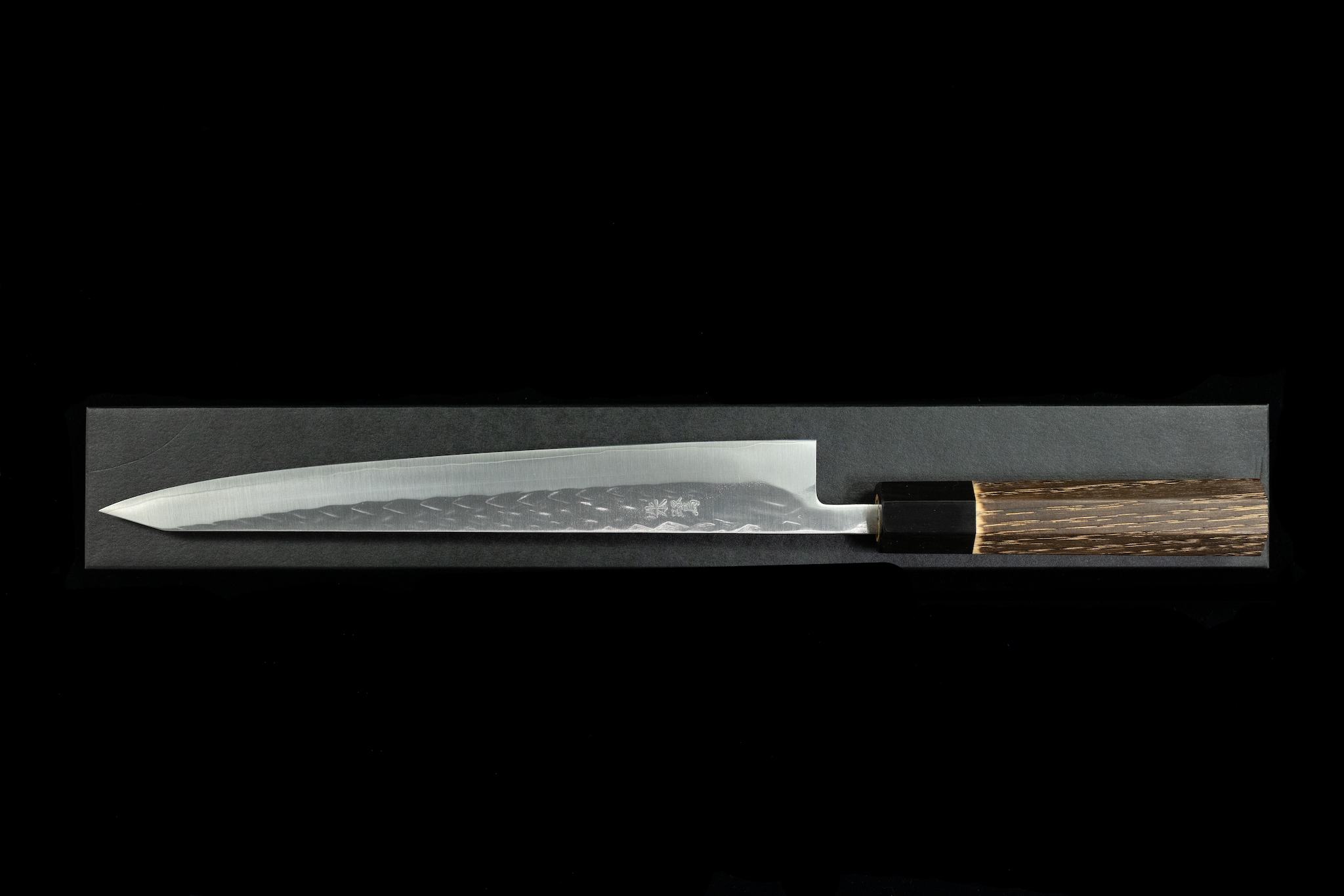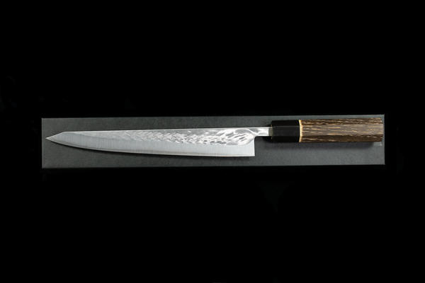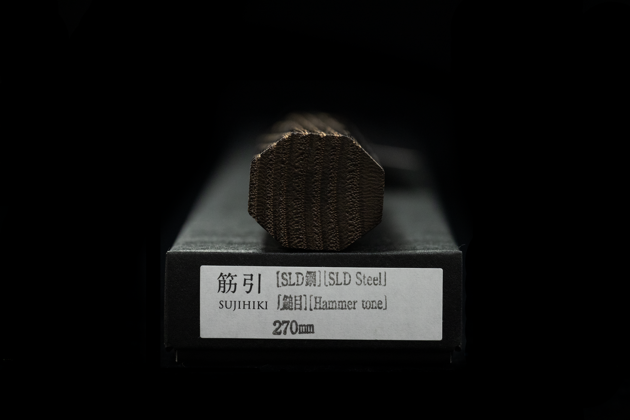 The Toki, or Crested Ibis, is an endangered species, once common in the Niigata area. Featuring white plumage on its body and a red head, the bird has been a part of Japanese folklore for generations. As this series is made in Sanjo, Niigata, the name Toki has significance. These knives are made by hand in a medium-sized workshop, focused on making user-friendly knives. Their knives tend to be a medium thickness, not super thin, but not like a super thick workhorse. The wide bevel designs work well for food release. And, because we love burnt chestnut handles, and they also come from Sanjo, the series features octagonal burnt chestnut handles with water buffalo ferrules.