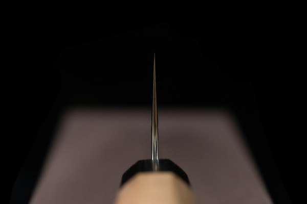These knives have an excellent profile, grind, and distal taper, as well as clean fit and finish. Both the kurouchi and migaki models are clad in stainless steel. The stainless cladding reduces the reactive surface area of the knives to the few millimeters in between the cutting edge and lamination line.