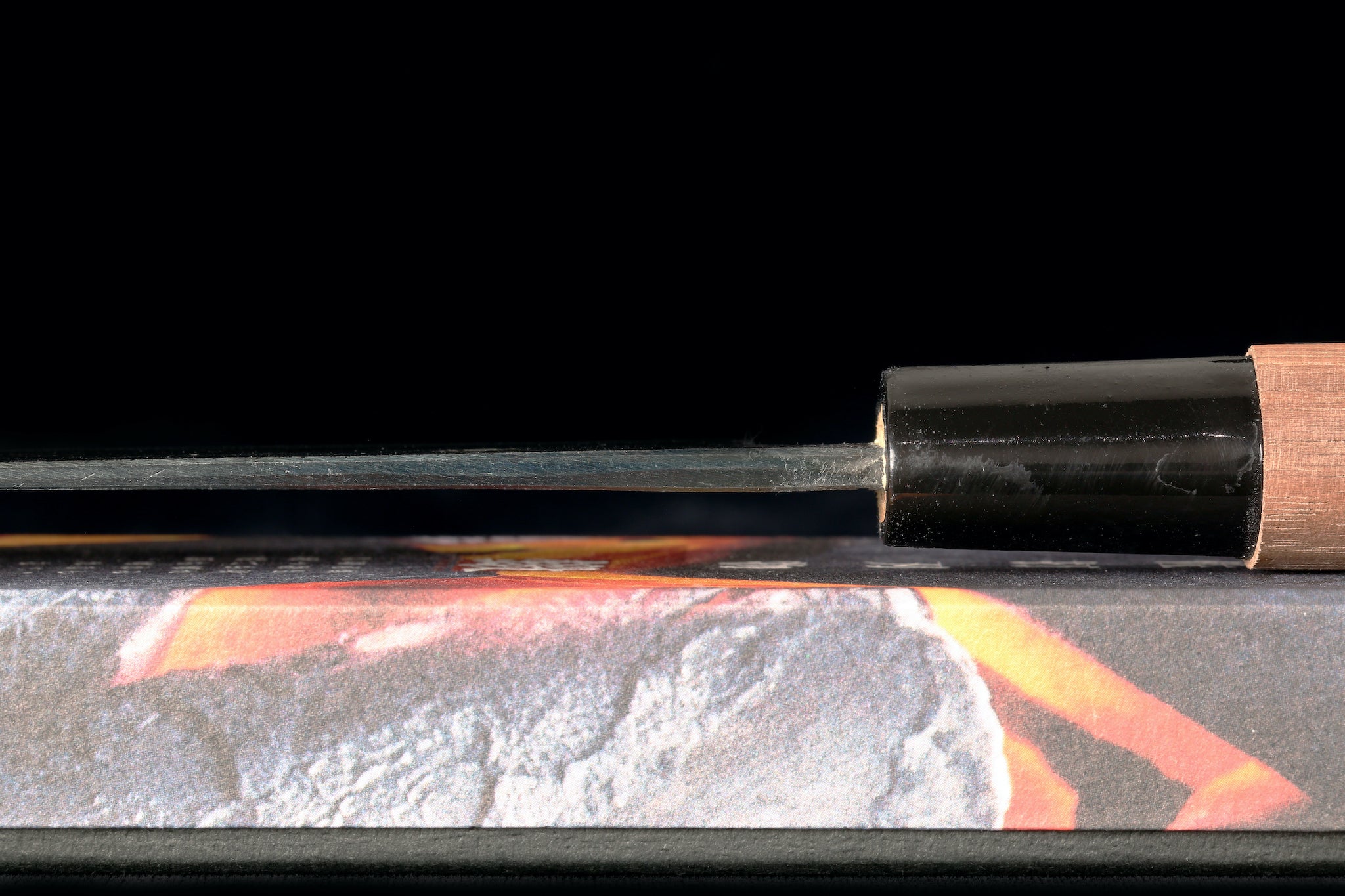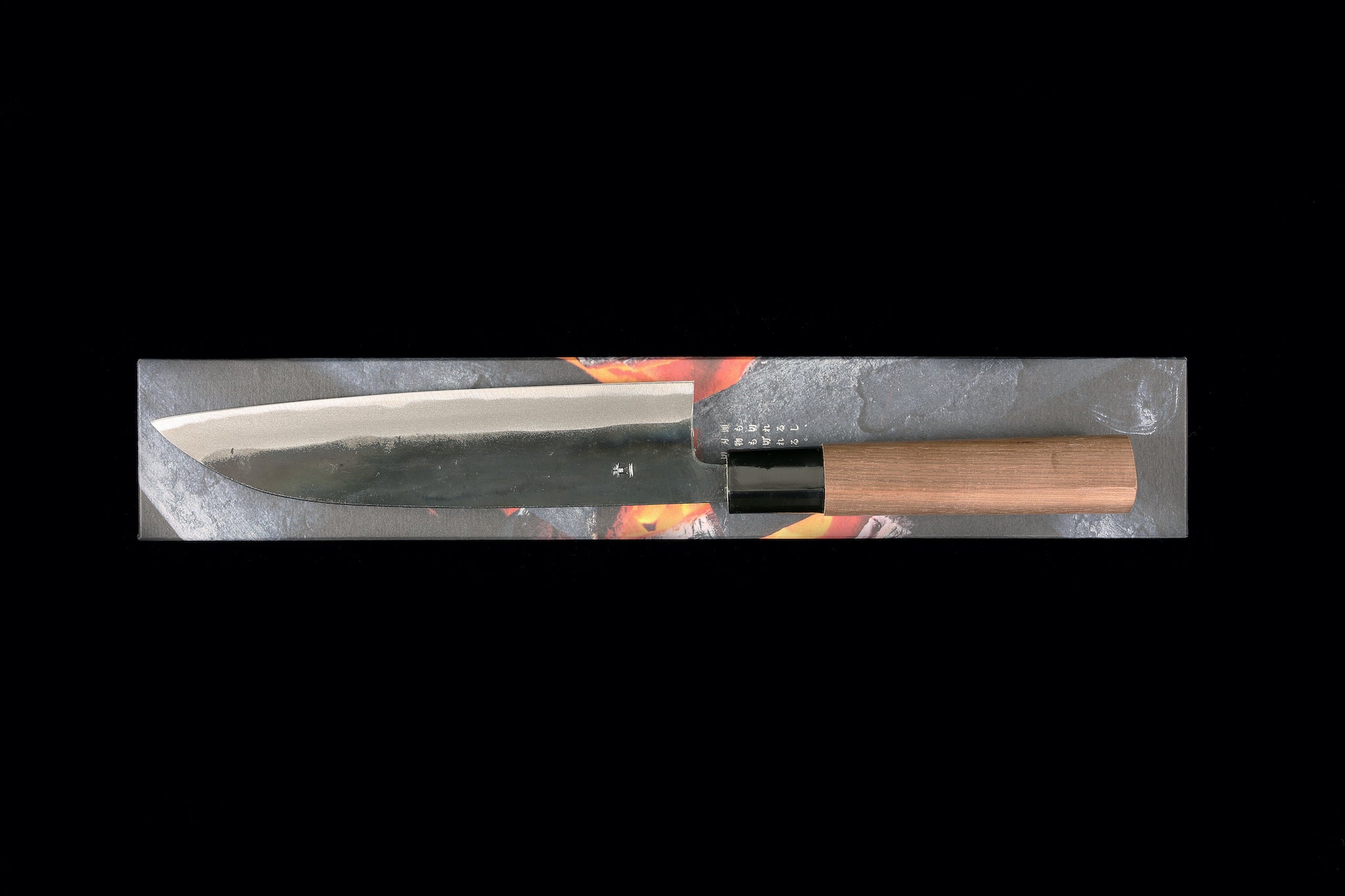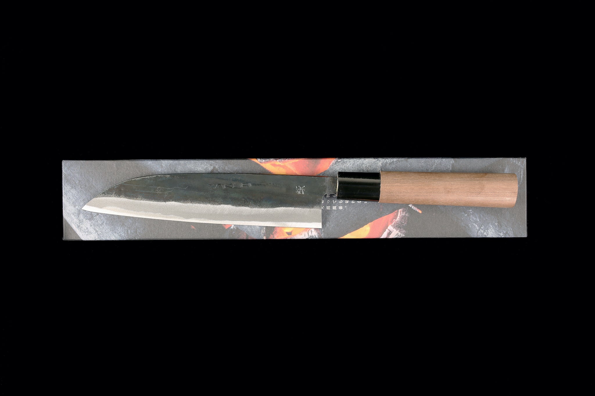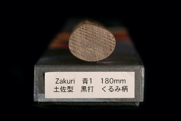 The knife is forged from blue #2 steel with damascus cladding. The black finish on the blades is called a kurouchi finish and is the residual scale from the forging process.