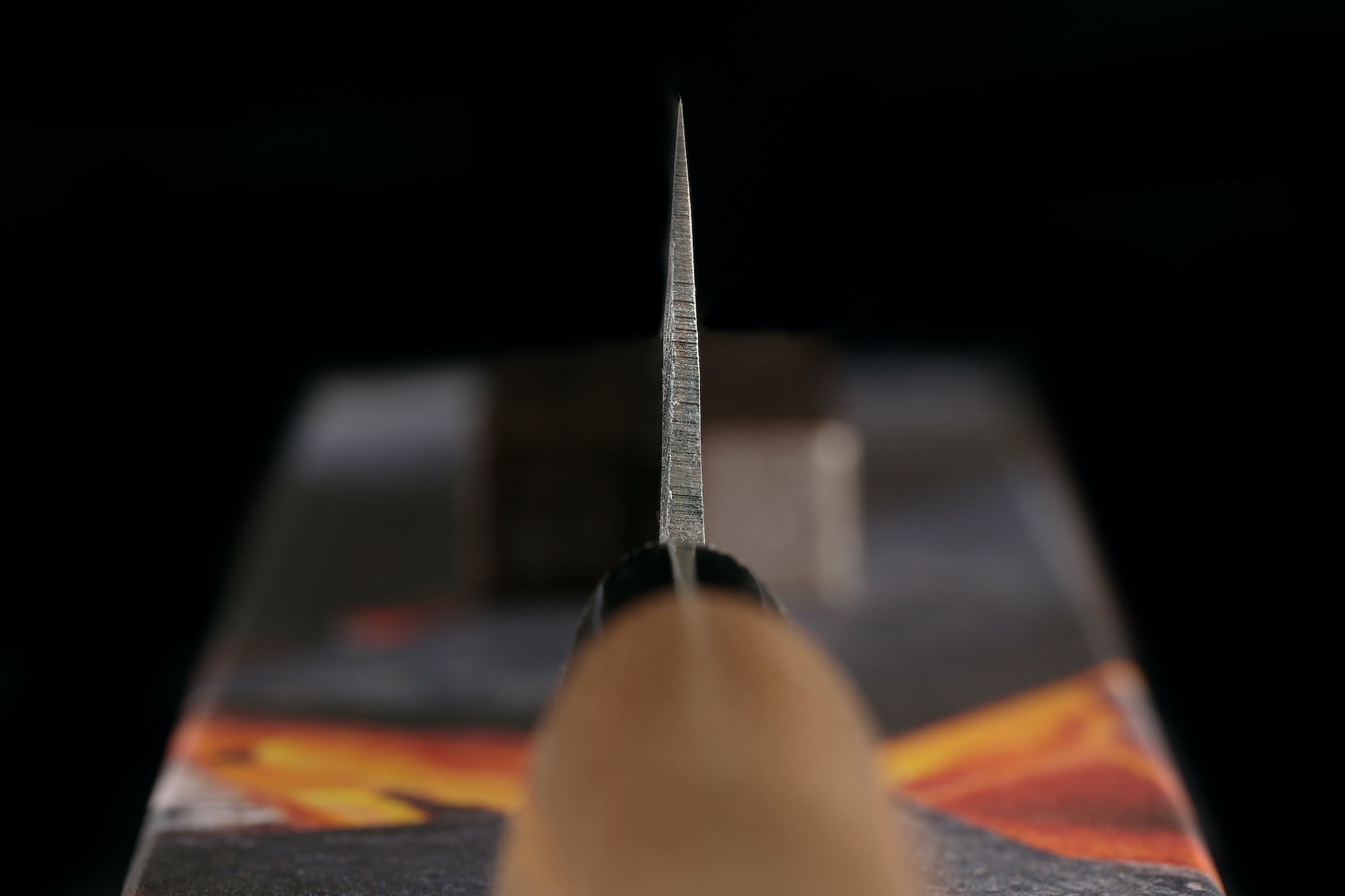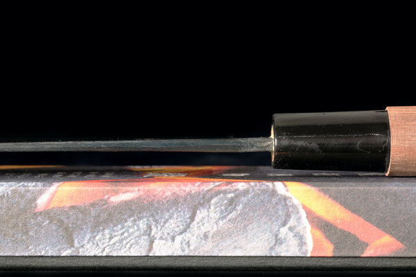 This Zakuri 100mm Kurouchi Damascus Utility knife was forged by Komatsu-san. When we visited the Tosa region, we met Komatsu-san and spent some time with him in his workshop. He specializes in outdoor knives, and every time I ask, he does not want to make kitchen knives. However, he's really talented and makes really great knives. So, for a couple of years, we've been trying to figure out how we can carry some of his knives since we really want to only focus on knives that can be used for food. This utility knife was our solution. It could make a nice camp knife for food, a utility knife in a kitchen, or a really cool box opener ;)