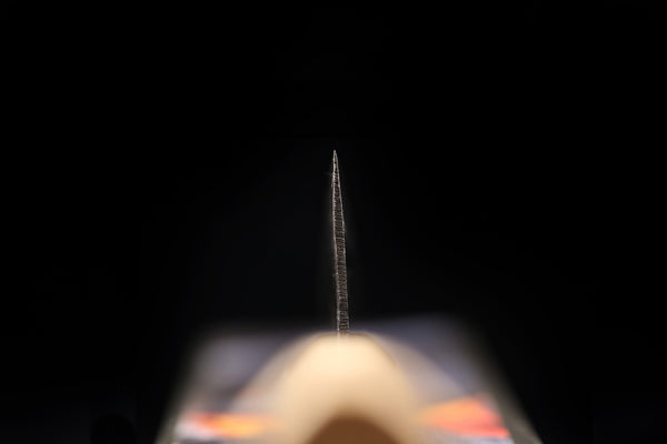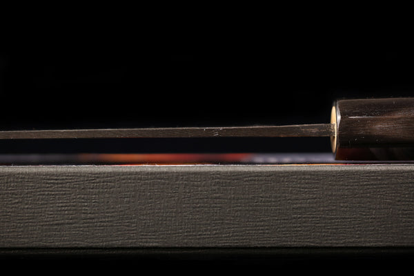 • This Zakuri 240mm Blue #1 Kurouchi Gyuto is a truly unique knife. The handles are larger than handles I have seen on other gyutos, though not prohibitively large so as to be uncomfortable for smaller hands (as long as a pinch grip is used). What does this mean? Well, better balance for one. Not necessarily weight balance, though it does help a little, but more bulk balance. The handle matches the blade, so to speak. The blade is a more robust shape. This is a knife just begging to get some serious use. Blue #1 is a great steel for knives. It has a very high carbon content, great ability to get sharp, and very good edge retention. Not too many knife makers use Blue #1 because it can be difficult to forge. This knife is not stainless will patina with use. If not cared for properly, it may rust. The kurouchi finish on this knife partially protects the blade from rust.